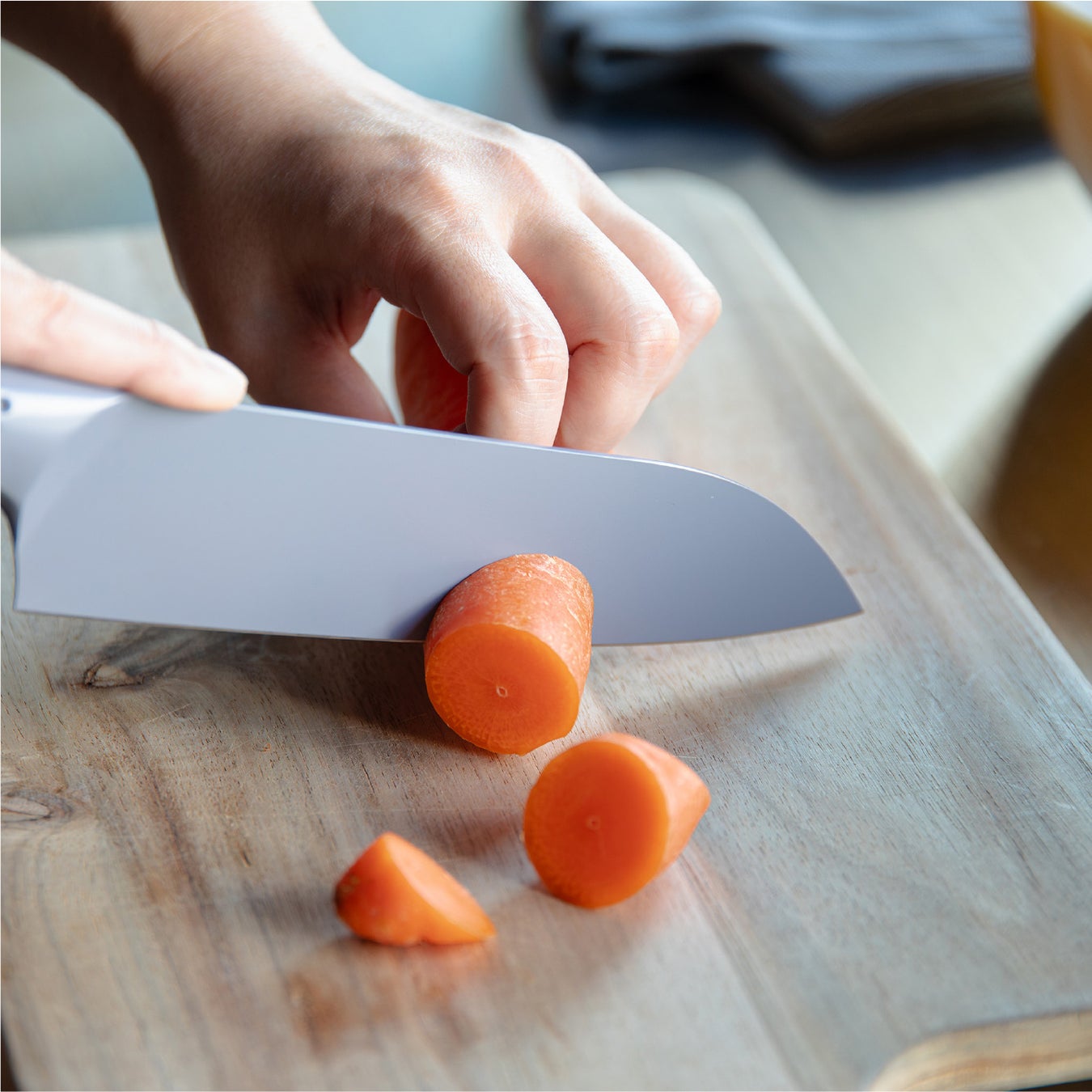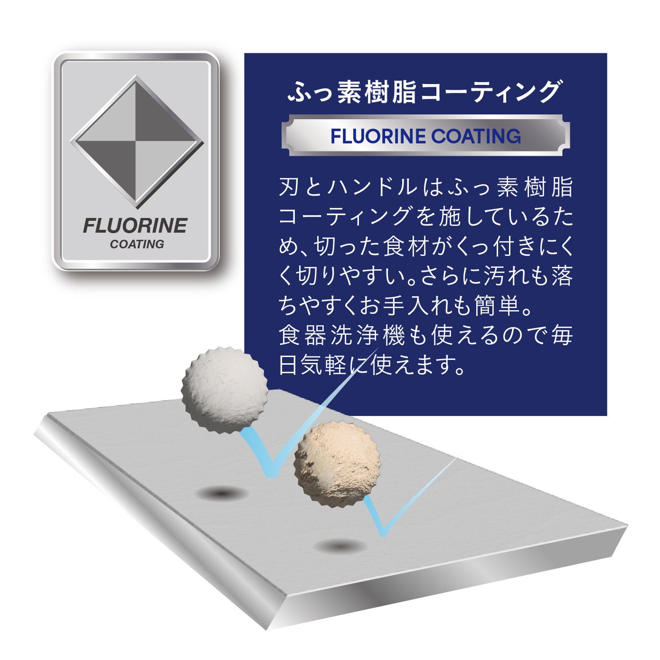 その上からふっ素樹脂コーティングを施しているため、切った食材がくっ付きにくく切りやすい。