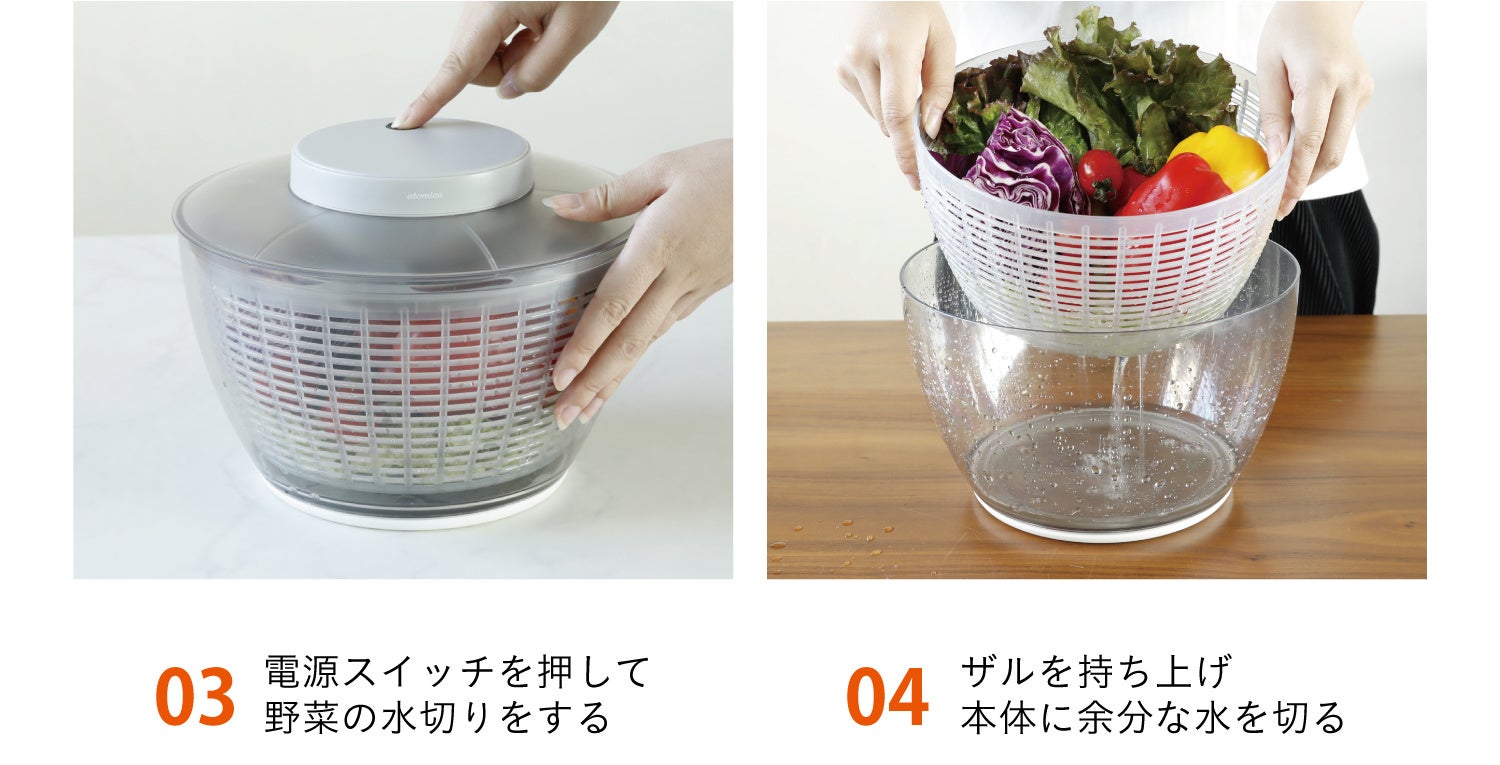 この「atomico コードレスサラダスピナー」は付属しているザルに野菜を入れて水洗いをした後、そのまま本体にセットするだけで自動で水切りが出来ます。
