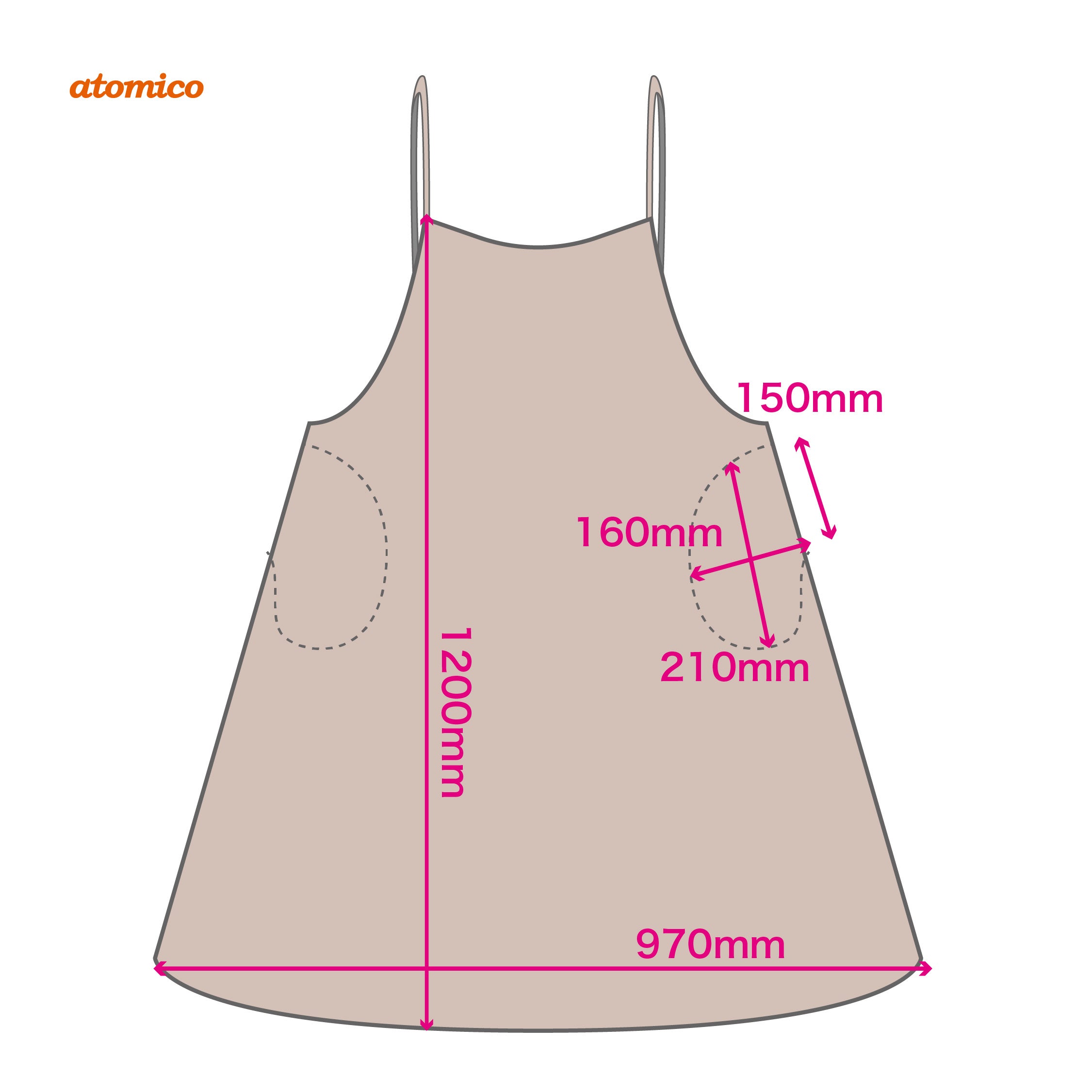 お財布や携帯がすっぽり収まるポケット付き。エプロンのシルエットを崩さないよう、両サイドにすっきり配置されています。両サイドに配置されていることで、屈んだりした際にポケットから物が落ちたりしにくいの