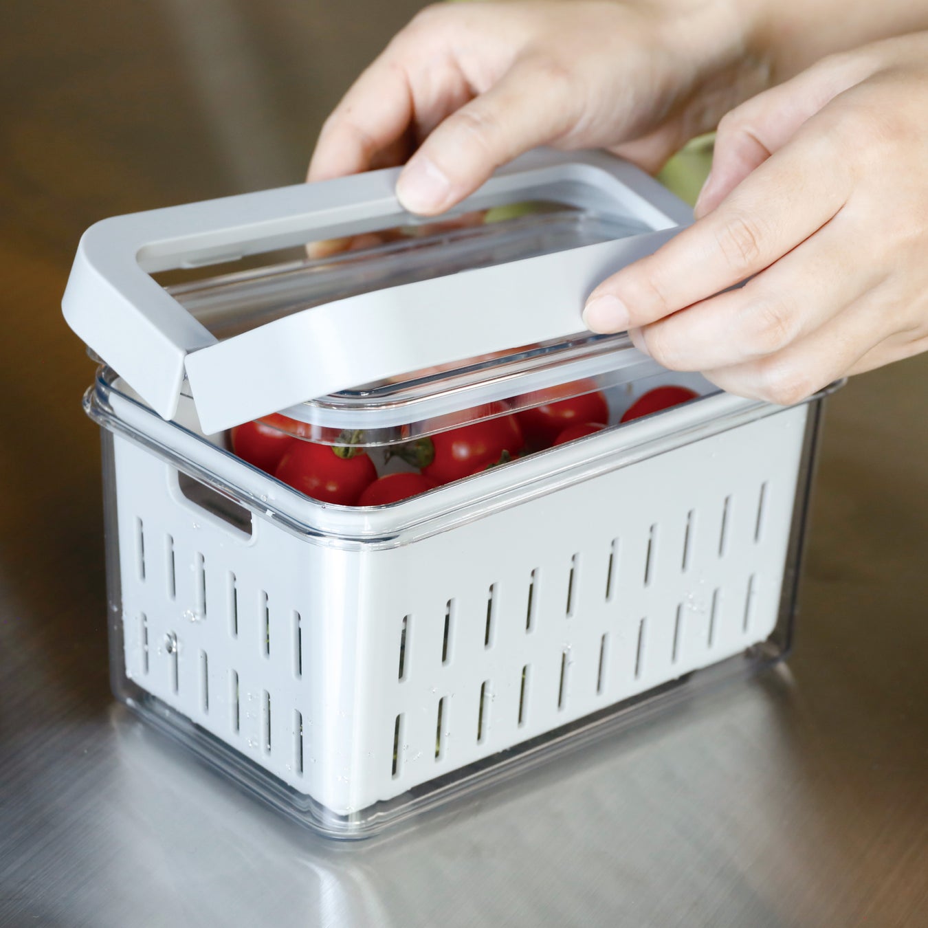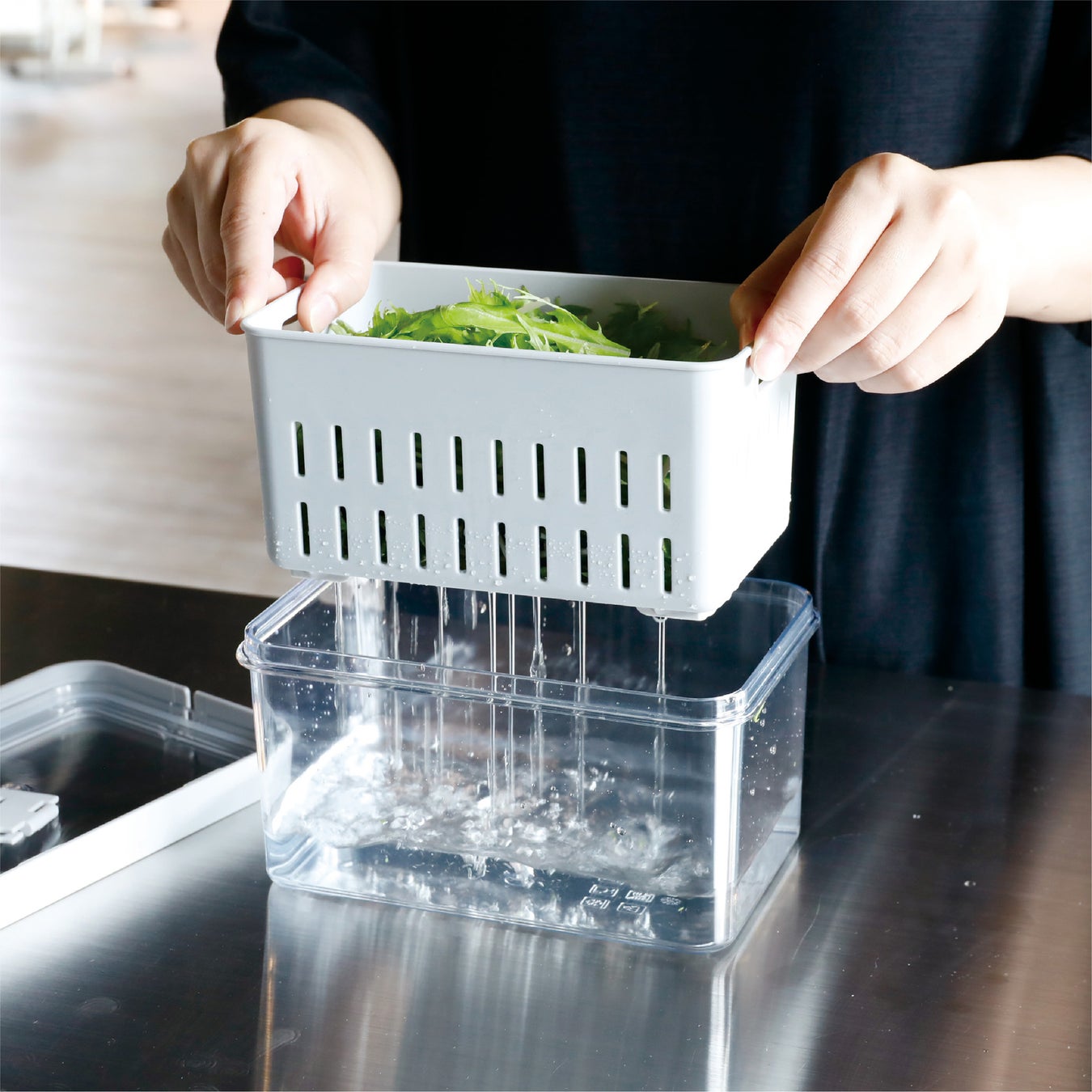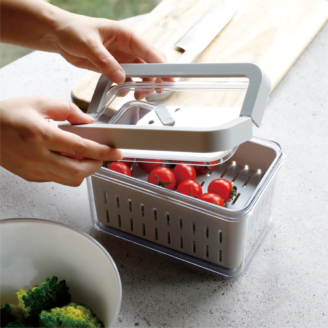 野菜や果物、サラダも洗ってそのまま冷蔵庫に保存出来る、便利な保存容器「野菜にやさしいザル付き保存容器 2L」。