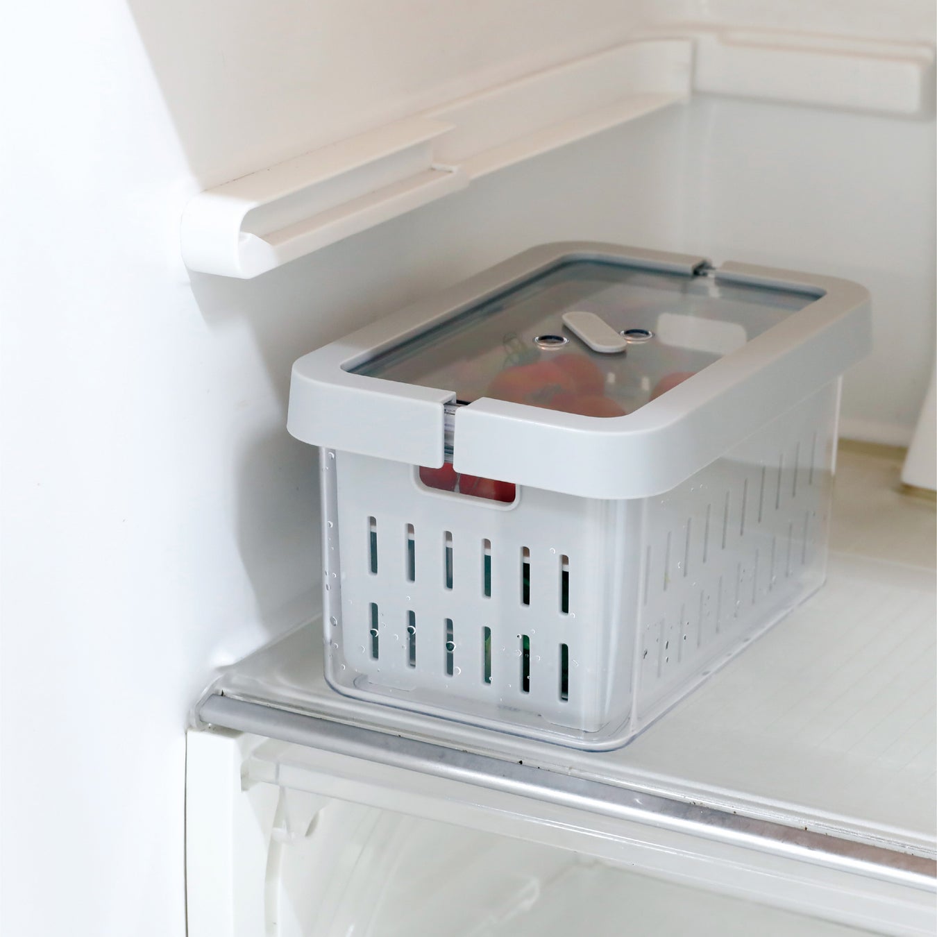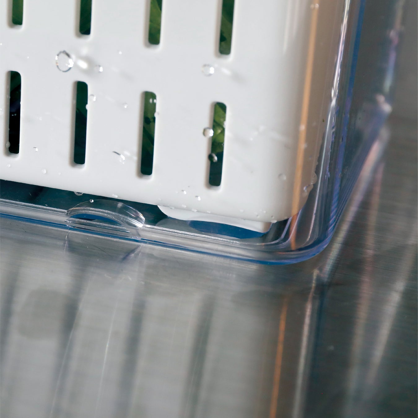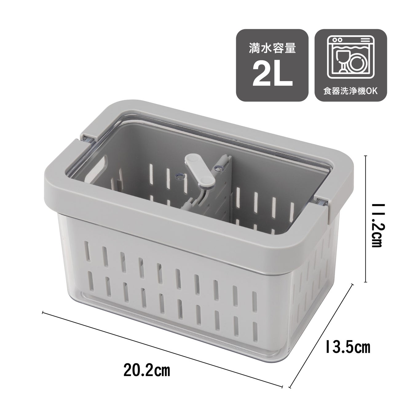 野菜や果物、サラダも洗ってそのまま冷蔵庫に保存出来る、便利な保存容器「野菜にやさしいザル付き保存容器 2L」。