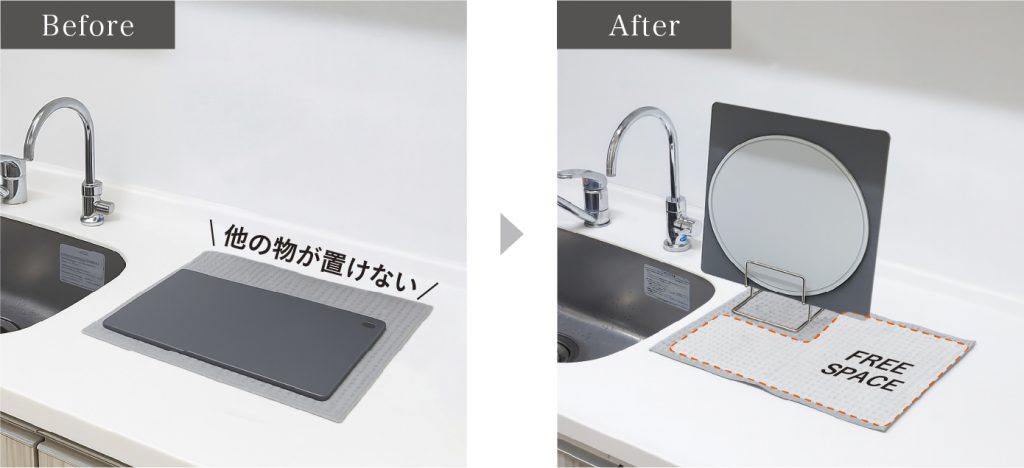 洗ったあとのまな板を立てて乾かすことで、シンク周りにスペースが生まれ、