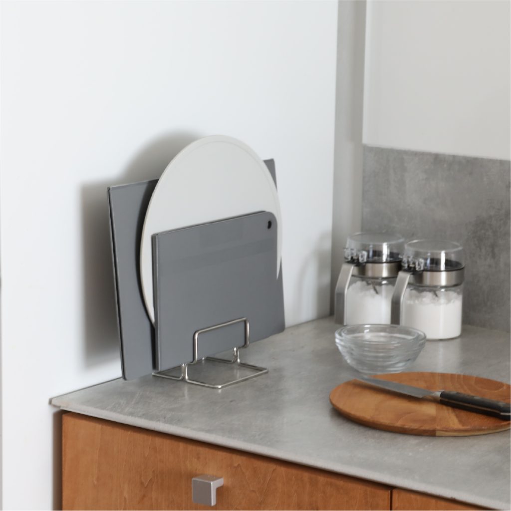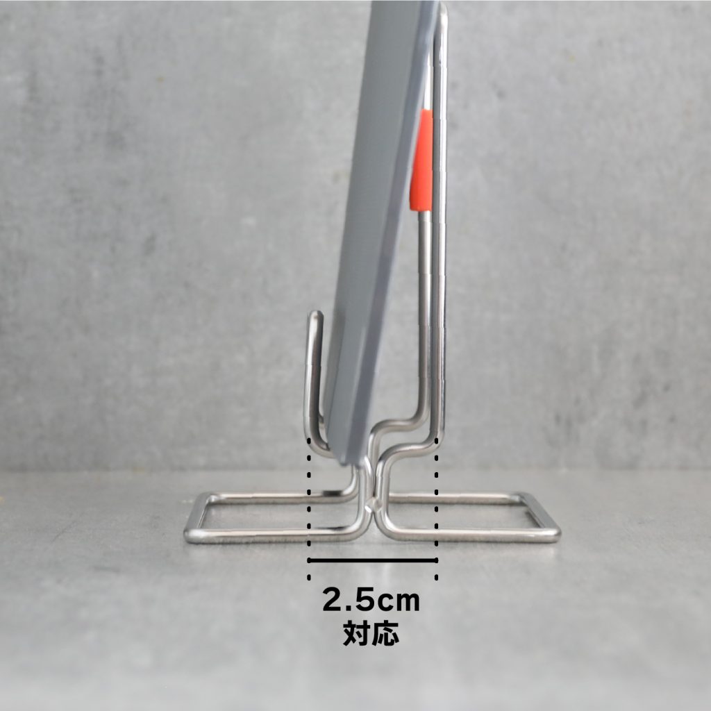 厚さ約2.5cmまでのまな板をしっかり支え、狭いキッチンにもすっきり収まります。