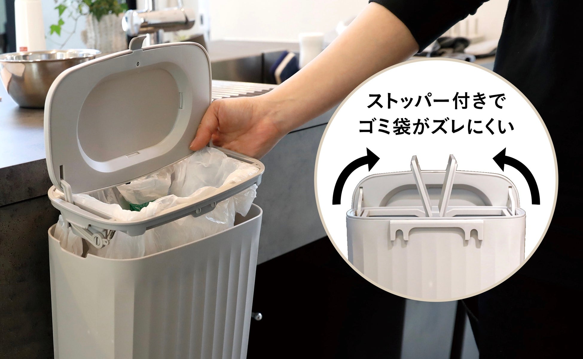 ゴミ袋を取り付ける際は、左右のストッパーを上に上げて引っ掛けるだけ。取り付けた後にストッパーを倒せばゴミ袋もズレにくく、イライラも解消されます。