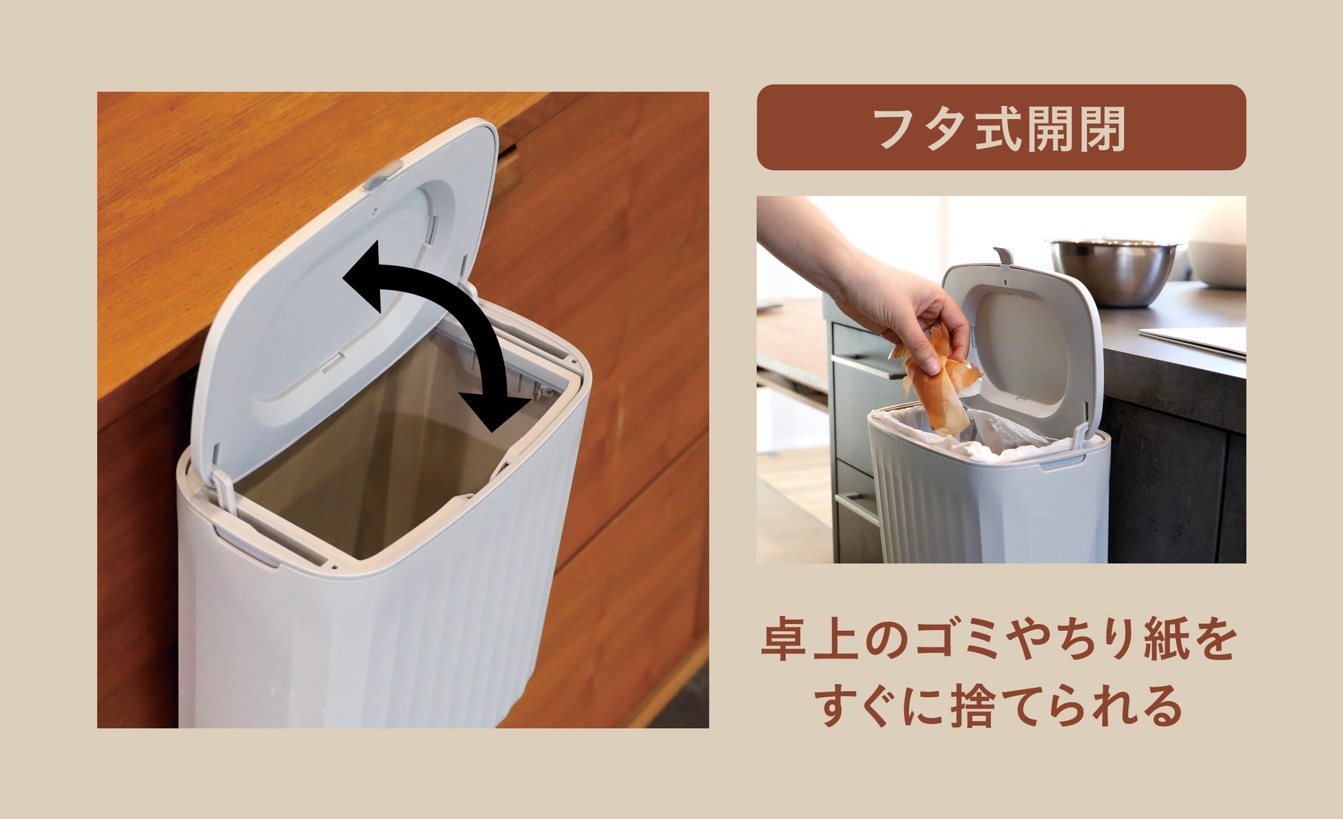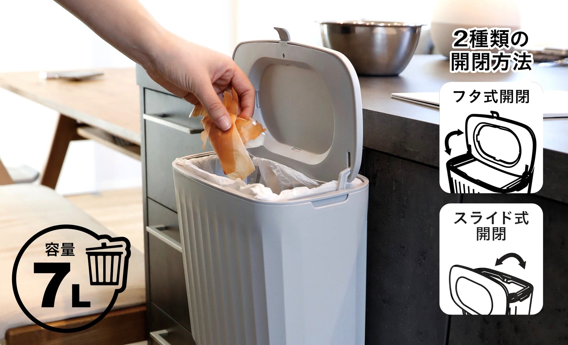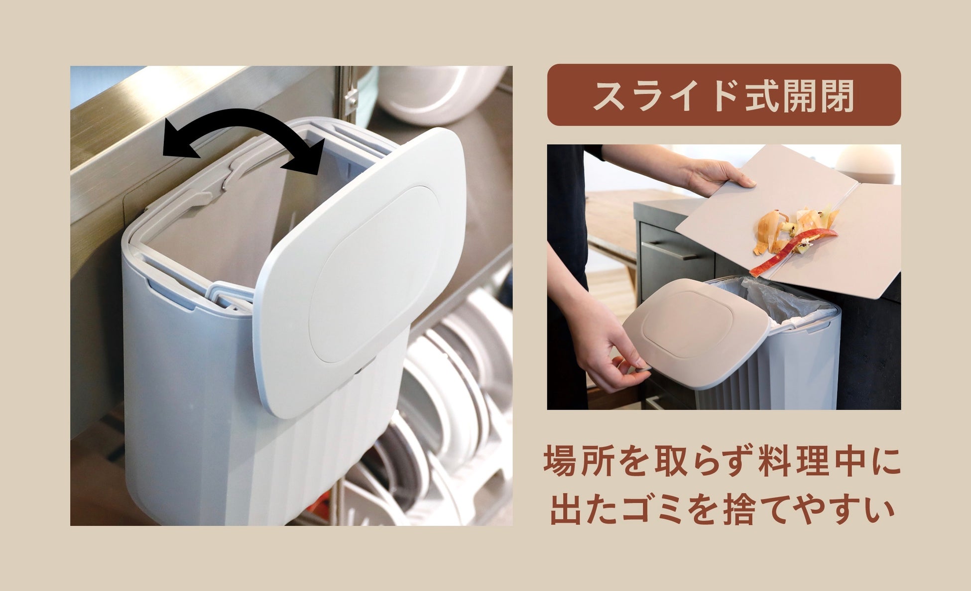 フタはそのまますぐにパカッと開ける「フタ式開閉」と、作業台側からゴミをスムーズに捨てられる「スライド式開閉」の2パターンの開き方ができ、場所に合った捨て方が選べます。