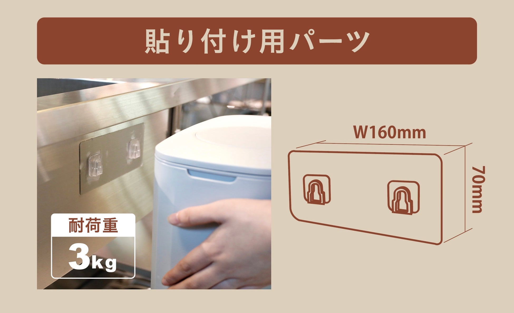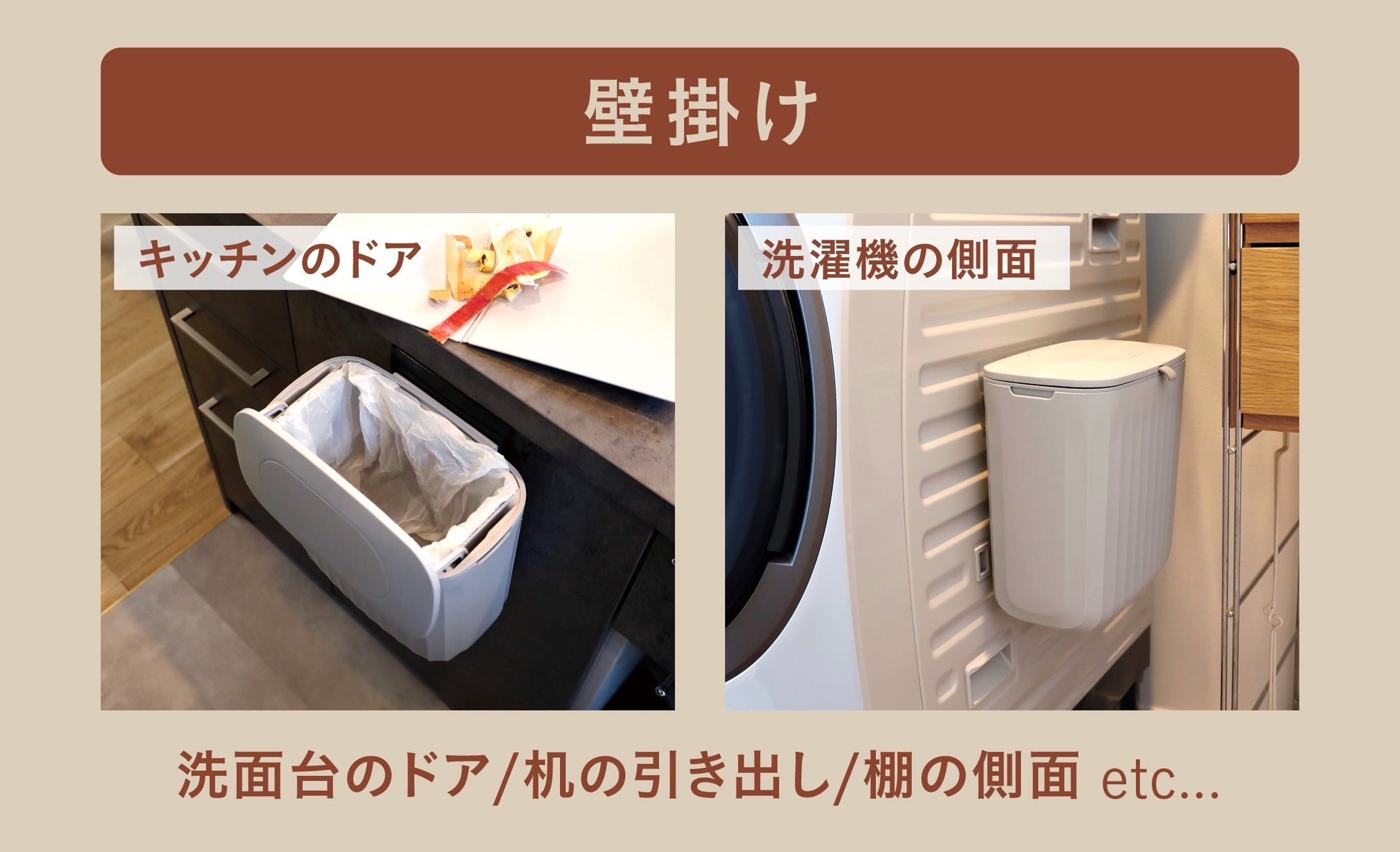 「壁掛け」する方法も2通りあります。壁や洗濯機の側面など、引っ掛ける部分が何も無い場所には「貼り付け用パーツ」を使って壁にくっつける方法と、引き出しやドアに設置したい場合は「ドア掛け用パーツ」を使って引っ掛ける方法があります。
