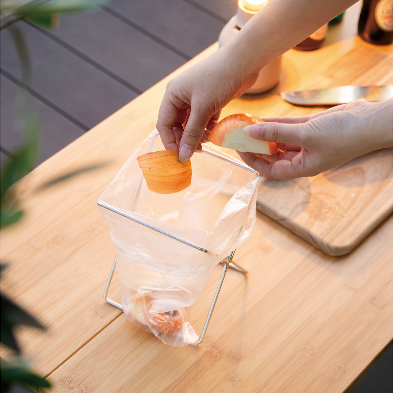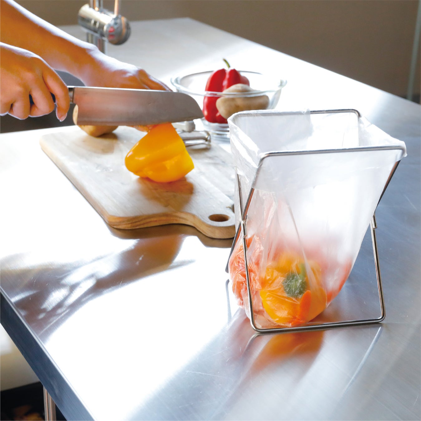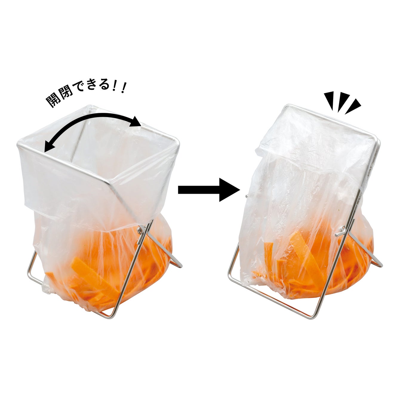 市販のポリ袋やビニール袋をセットするだけで、簡易ゴミ箱として使えるポリ袋スタンド。