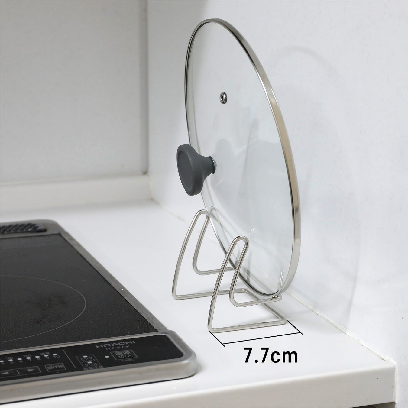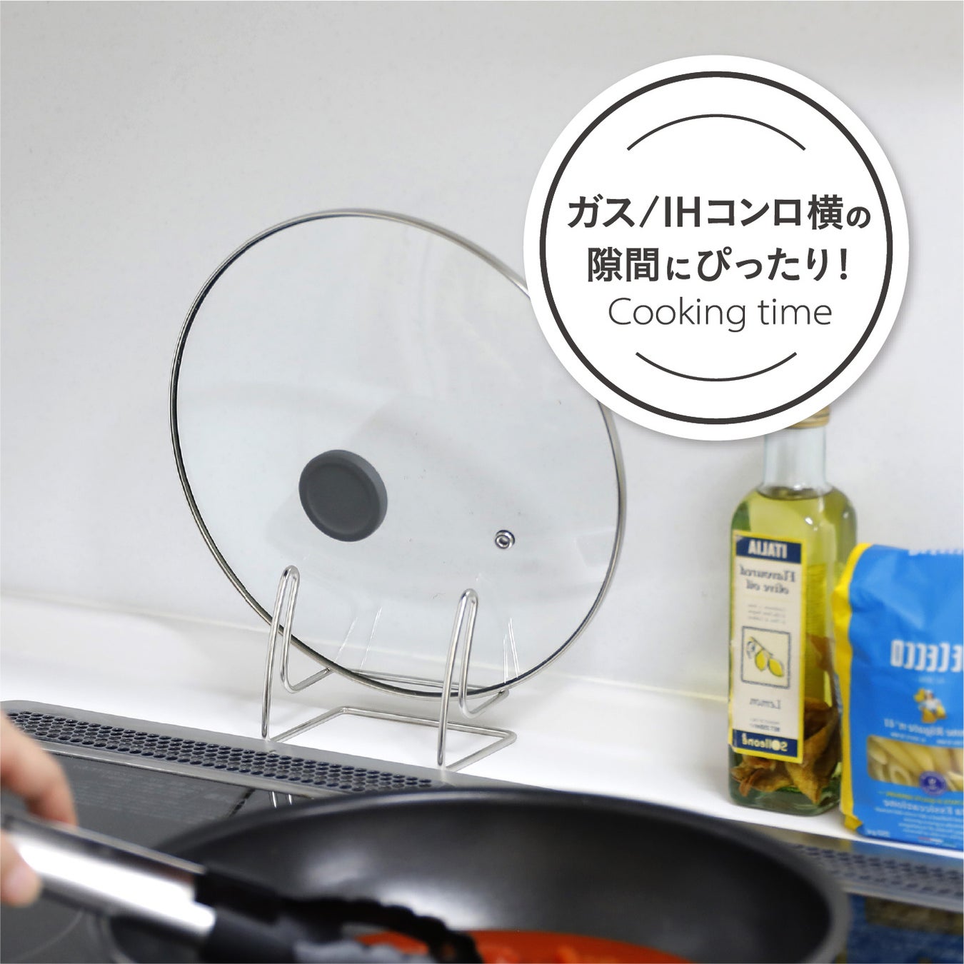 サッと置けるので調理中の一時置きにも便利な、鍋フタをスリムに立てられる『鍋フタスタンド』が新登場。