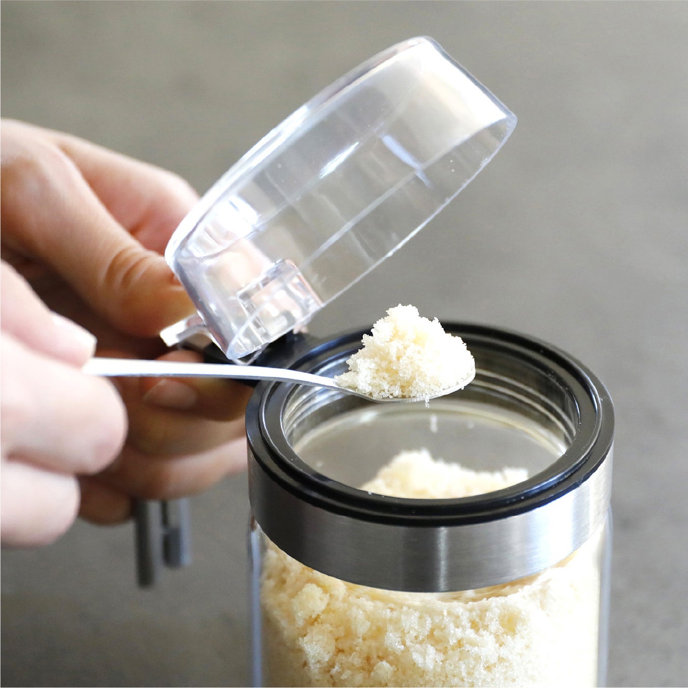 調味料を酸化から守るフタが付いており、ハンドルを持つ手でそのまま開けられるのでとても便利。