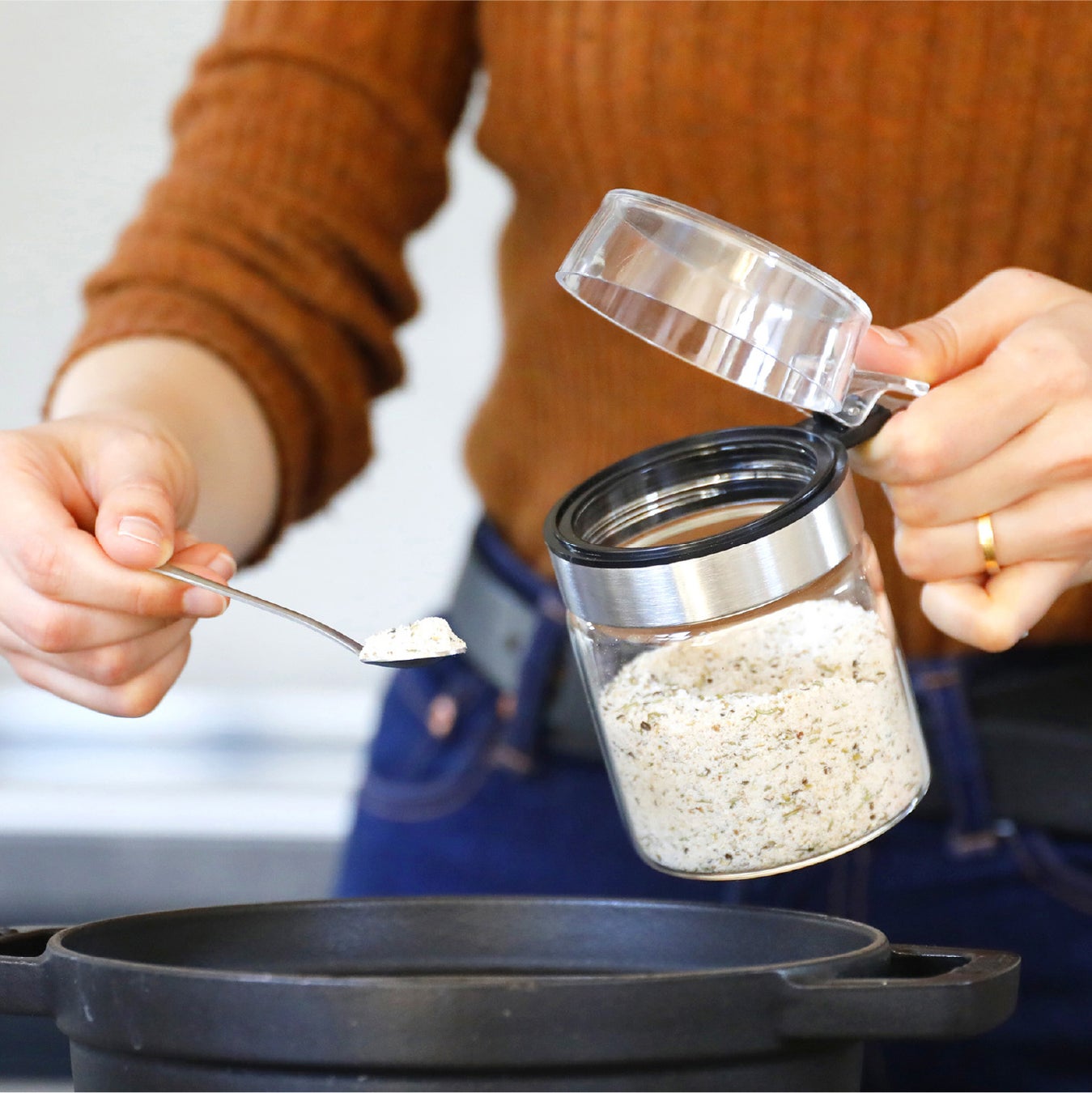 片手でパッと開けて使える『耐熱ガラス調味料ポット』。