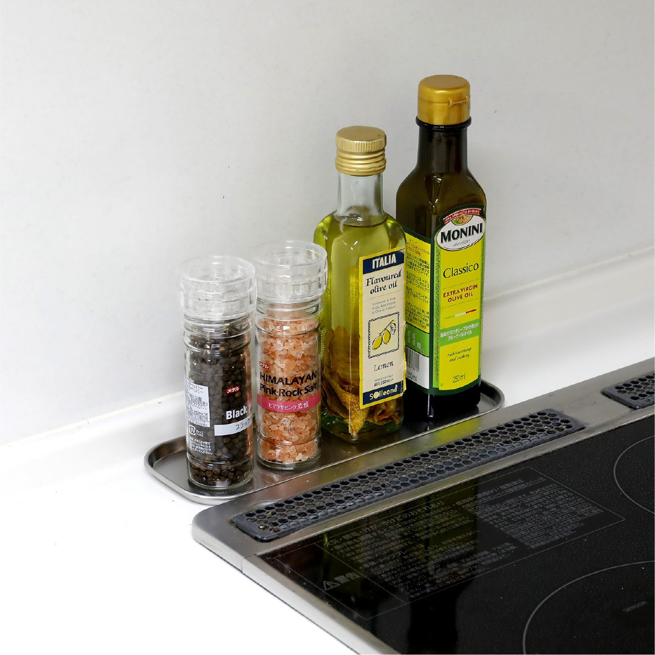 コンロの奥や横のスペースにも丁度良いスリムなサイズなので、調味料トレーとして使えば