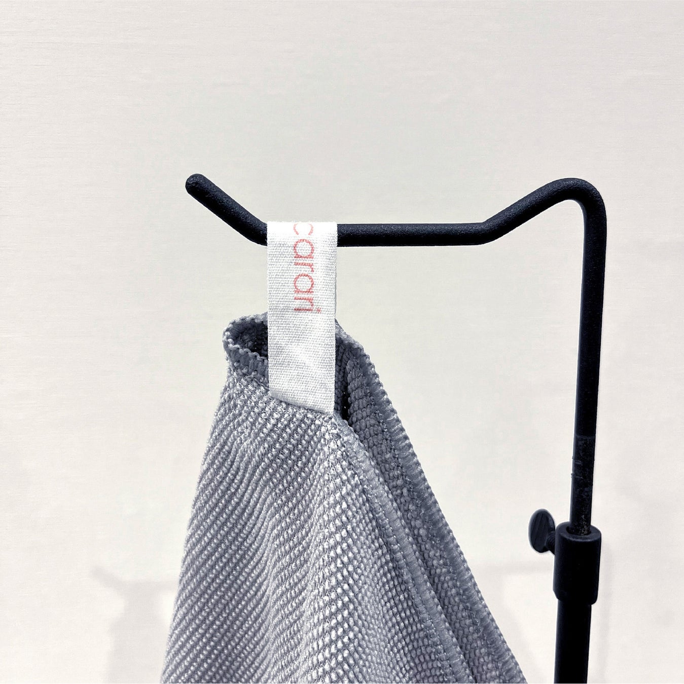使いやすい場所に掛けて収納出来るリボン付き。洗って乾燥させるときも便利です。