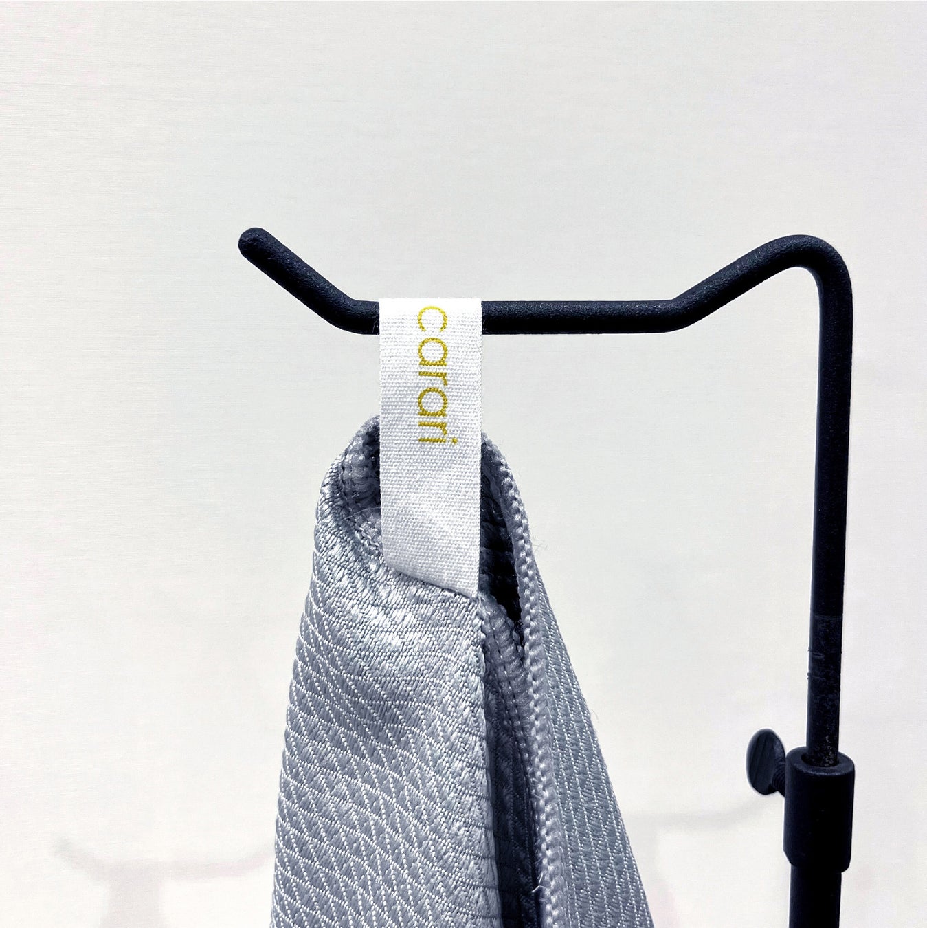 使いやすい場所に掛けて収納出来るリボン付き。洗って乾燥させるときも便利です。