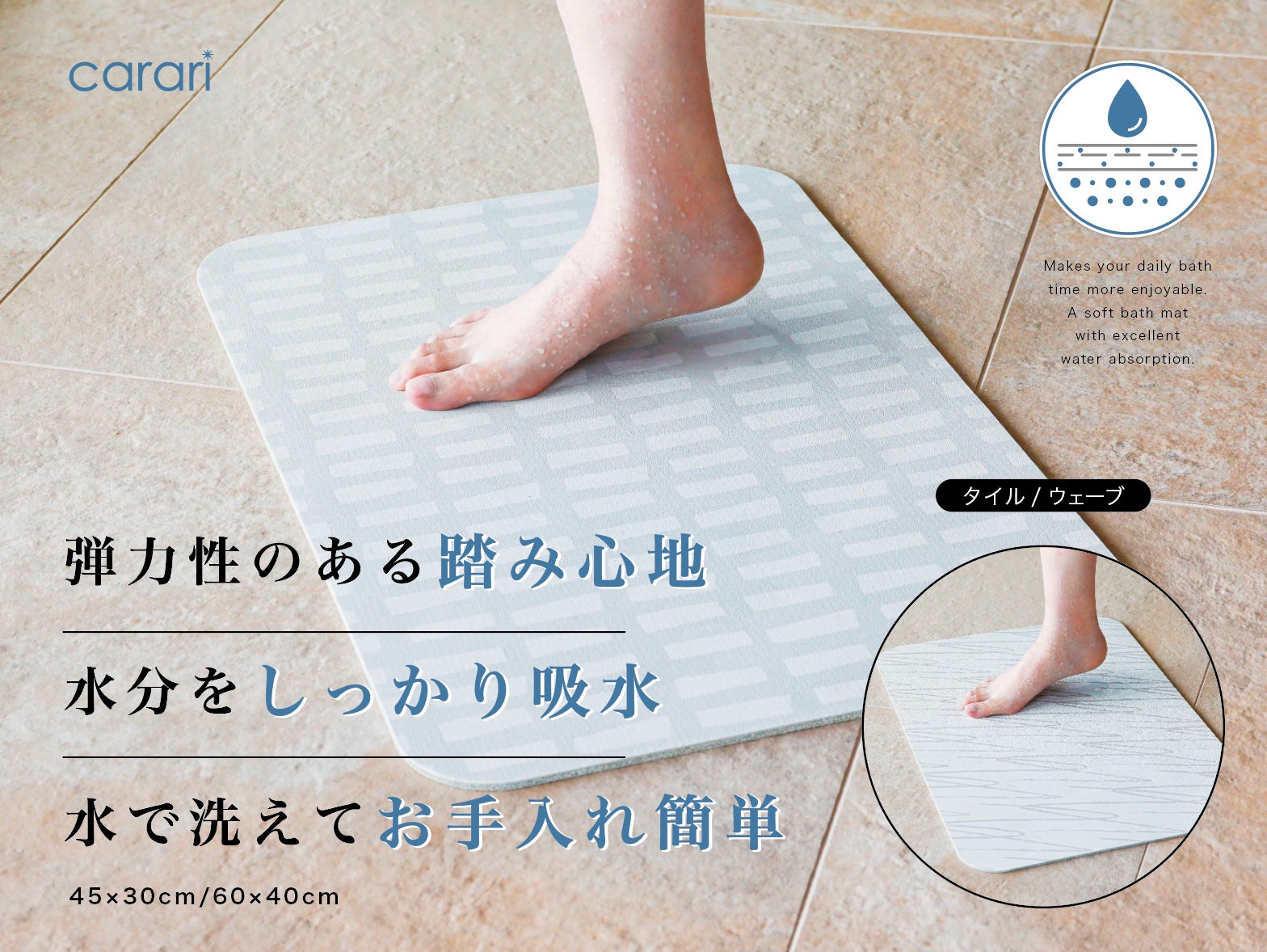 天然ゴム素材が踏んだ瞬間に水分を吸収してくれるので、タオル素材の様に水浸しになることがありません。
