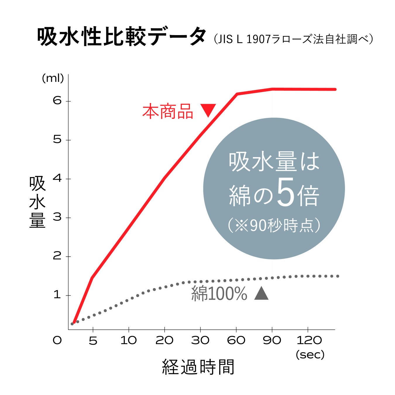 まるでタオルが肌に吸い付くように、水分をしっかり吸水。吸水量はなんと綿タオルの約5倍!