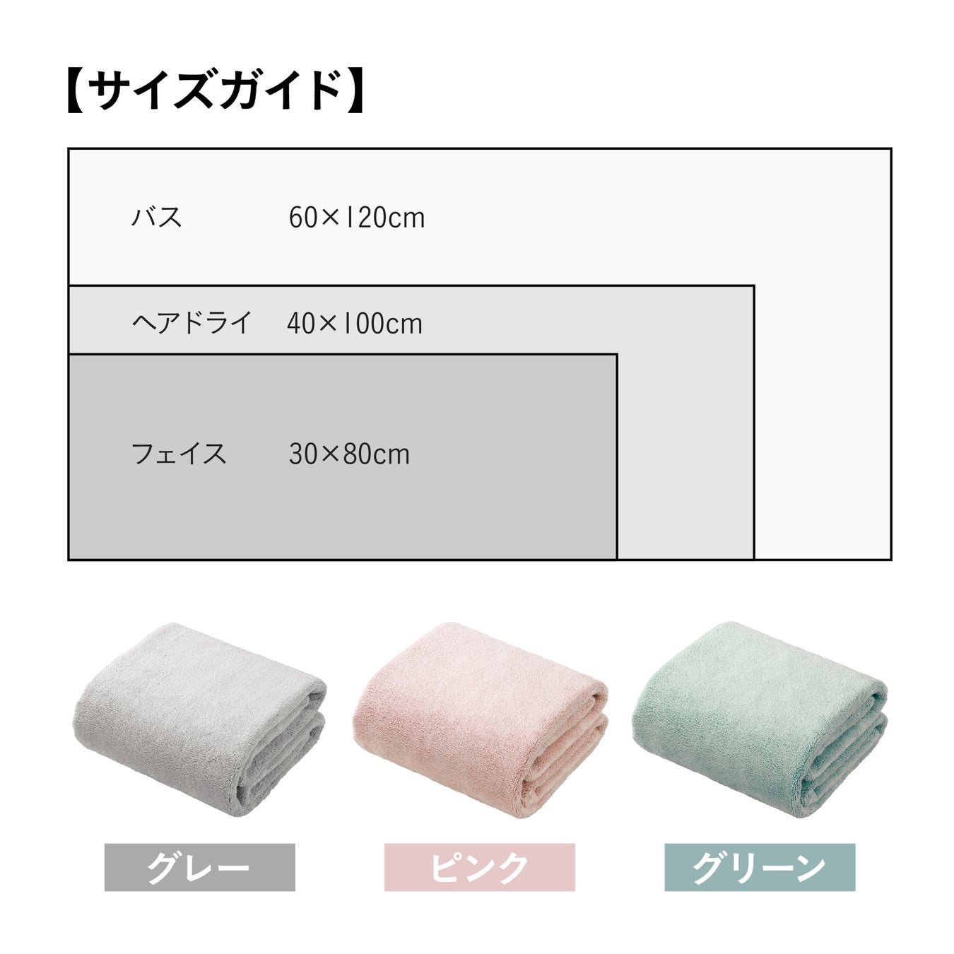 フェイスタオルは3枚、ヘアドライ・バスタオルは2枚組のセットなので、洗い替えにとても便利。(セットは同色です)
