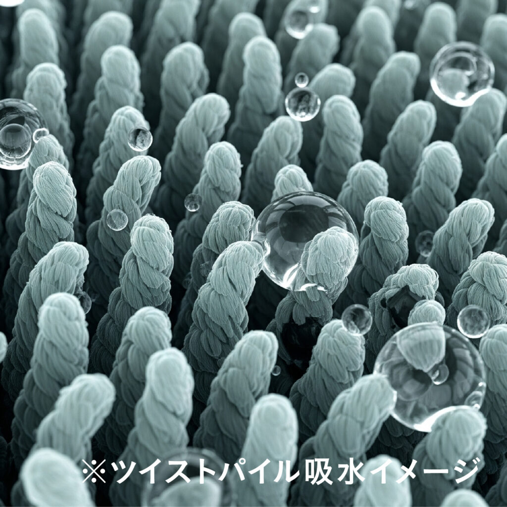 吸水力に優れたマイクロファイバーをさらにツイストパイル状に加工することで、繊維1本1本の表面積が大きくなり、水滴をすばやく効率的にキャッチ。タオルを滑らせるだけで大量の水を絡め取ることができるため、毛羽立ちや糸くずも残りにくく、拭き跡のない仕上げが可能になりました。