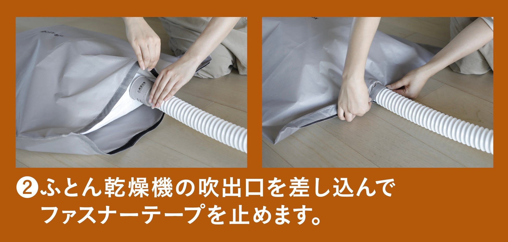様々な形のホースに対応できるファスナーテープ仕様のため、お手持ちのふとん乾燥機ですぐに使えます。