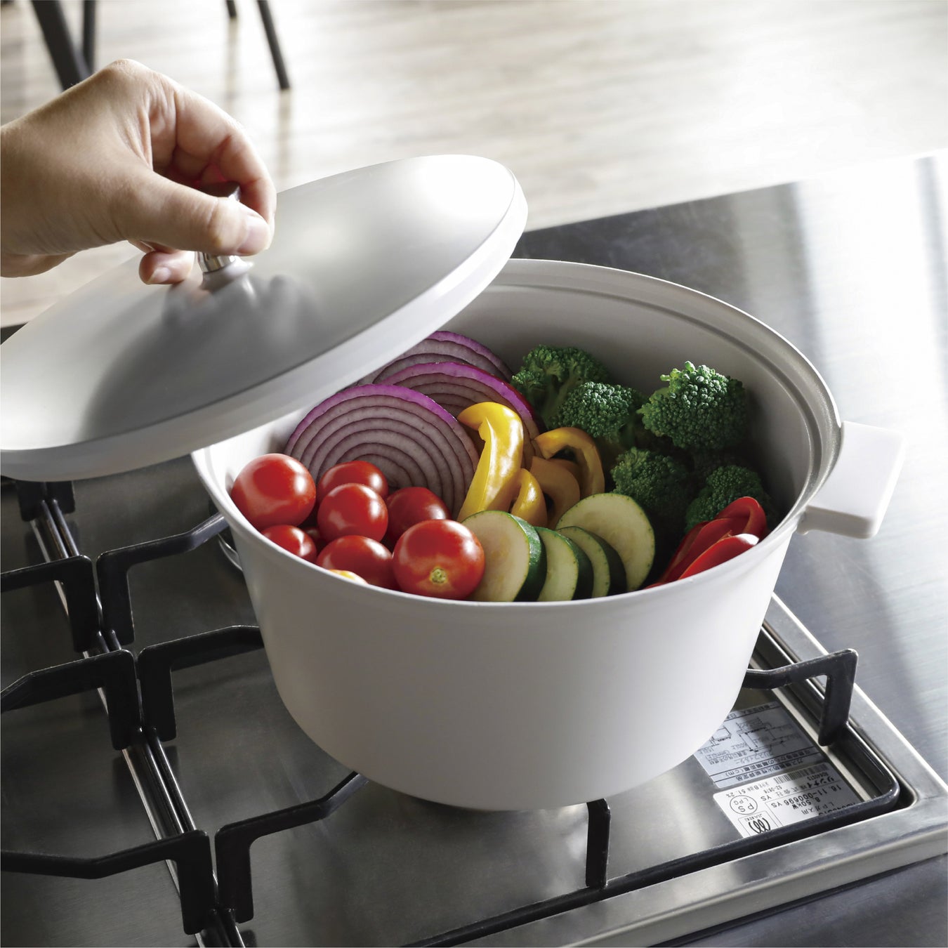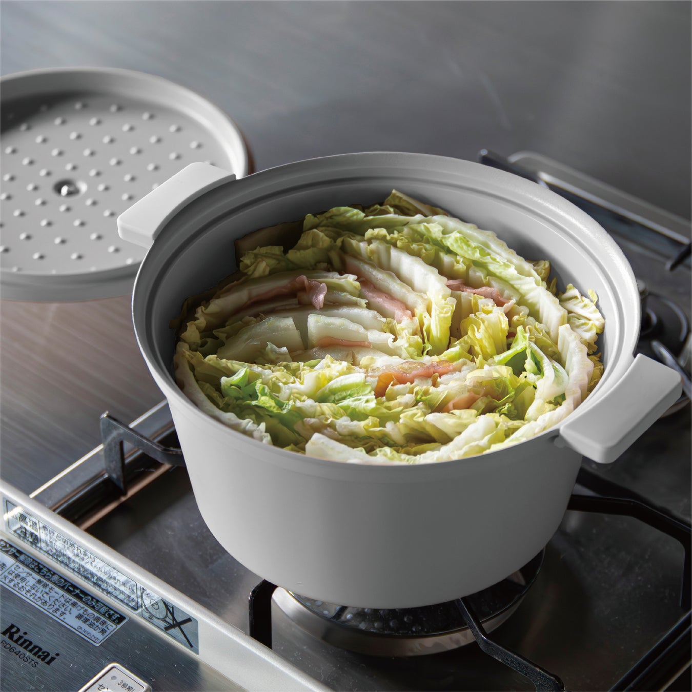 食材の水分が本体と蓋の間に水の膜を作り、鍋を密封状態にすることで中を定温・定圧に保ちます。少量の水や油・素材の持つ水分や油分だけで調理出来るので、水に溶け出してしまうビタミンやミネラルなどのうま味成分の損失が少ない調理が可能です。