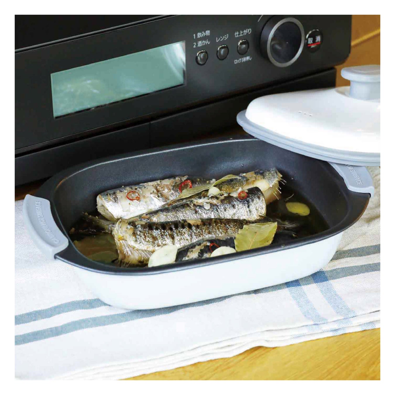 複数の魚を丸ごと電子レンジで調理出来る「長方形型のレンジグリル」