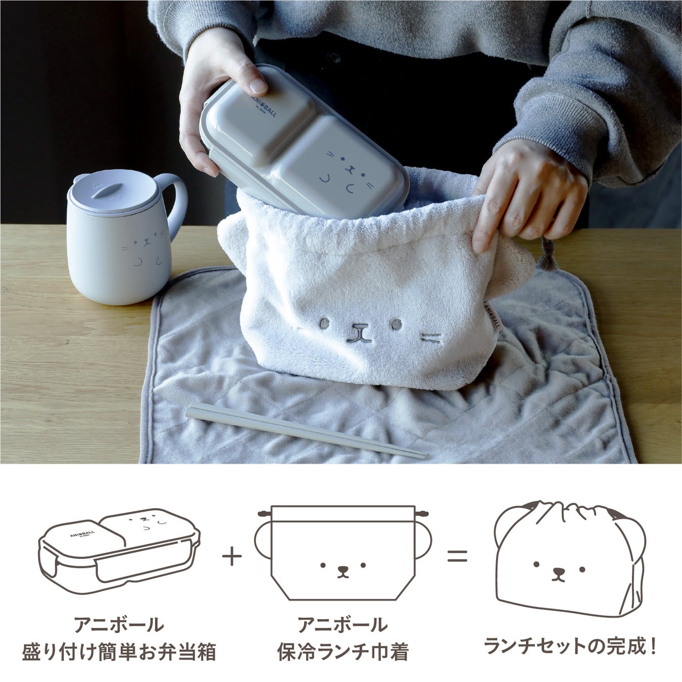 『アニボール 盛り付け簡単お弁当箱』と『アニボール 保冷ランチ巾着』のサイズ感はぴったり。