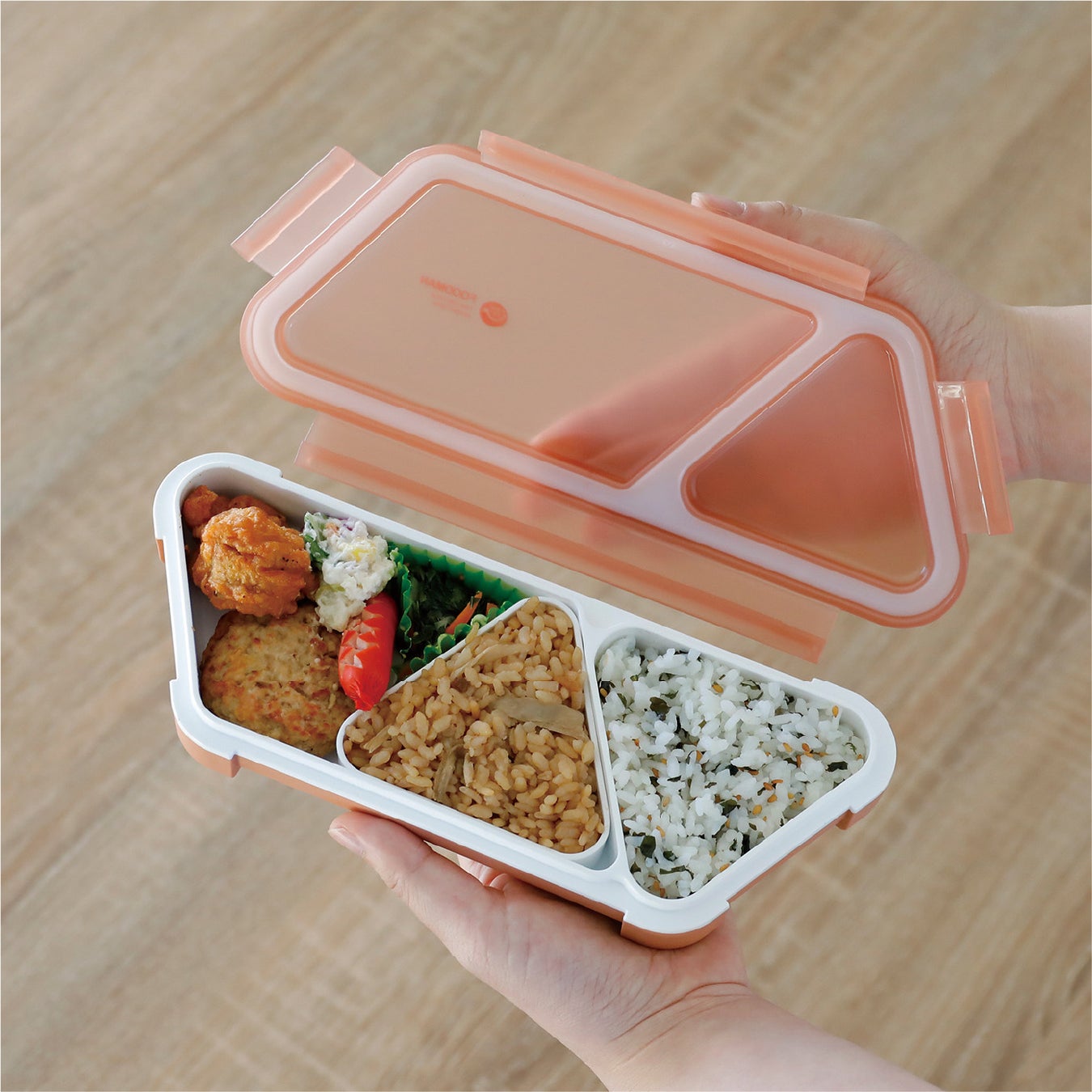 立てて持ち運べるのでかさばりません。さらに❷のシーリングは各スペースの汁移りも防ぎ、おかずなどの味移りも防止します。