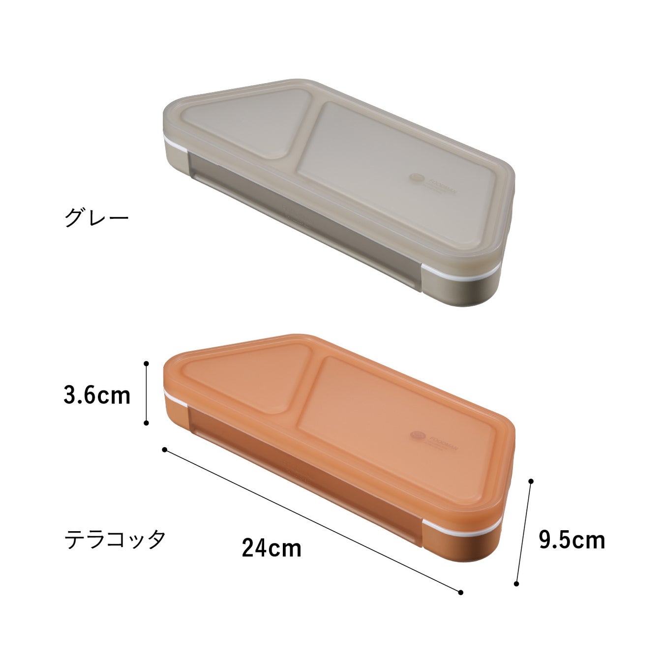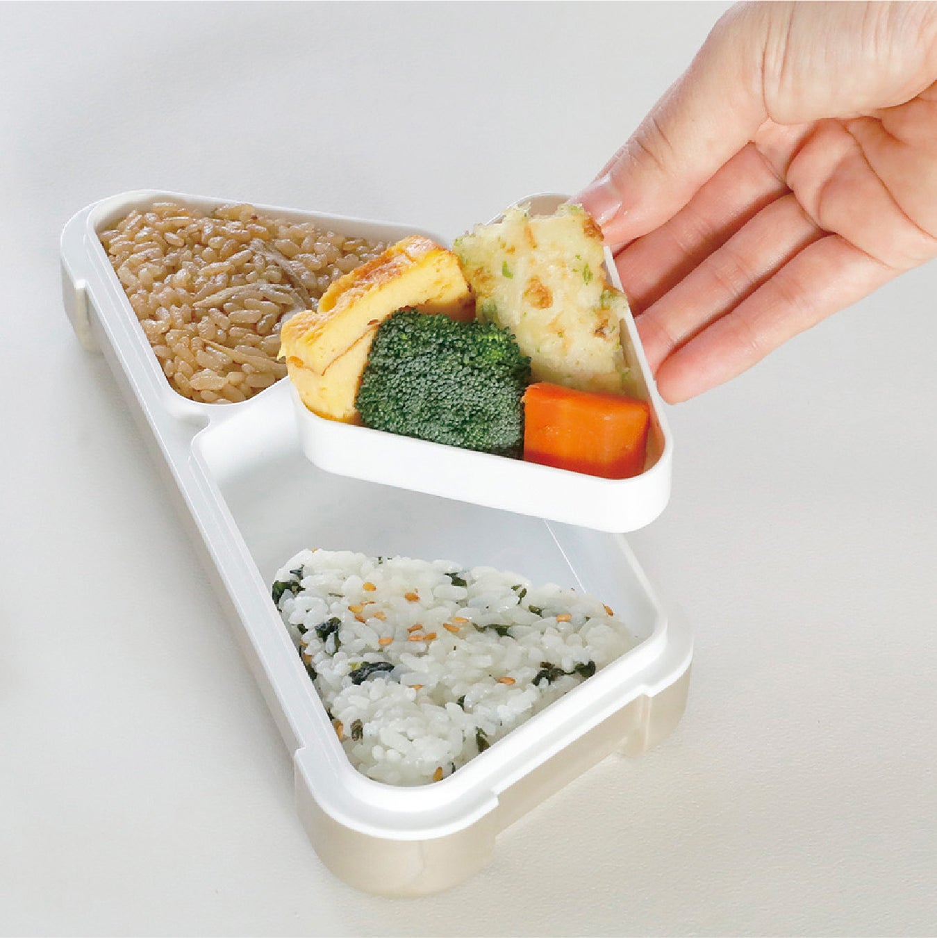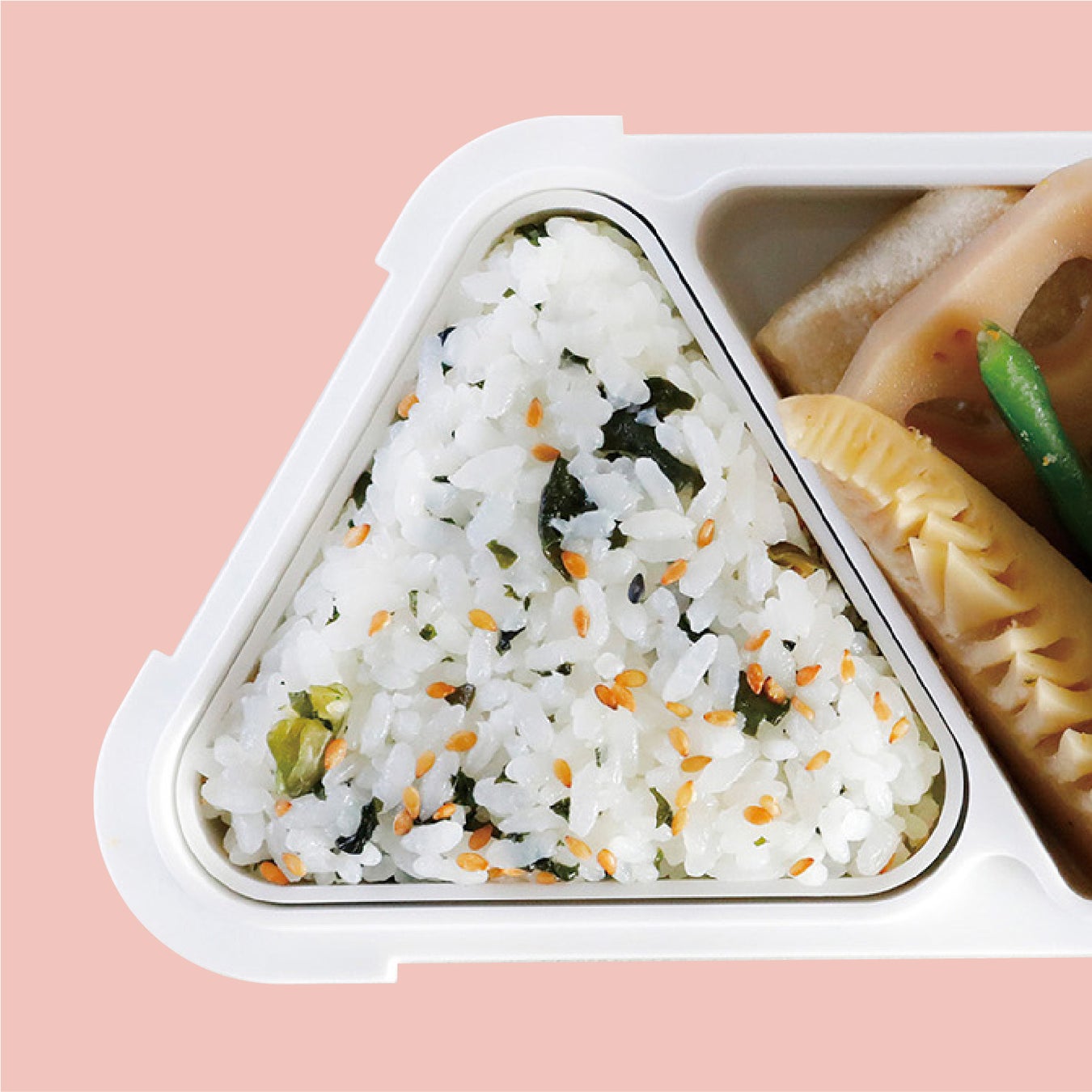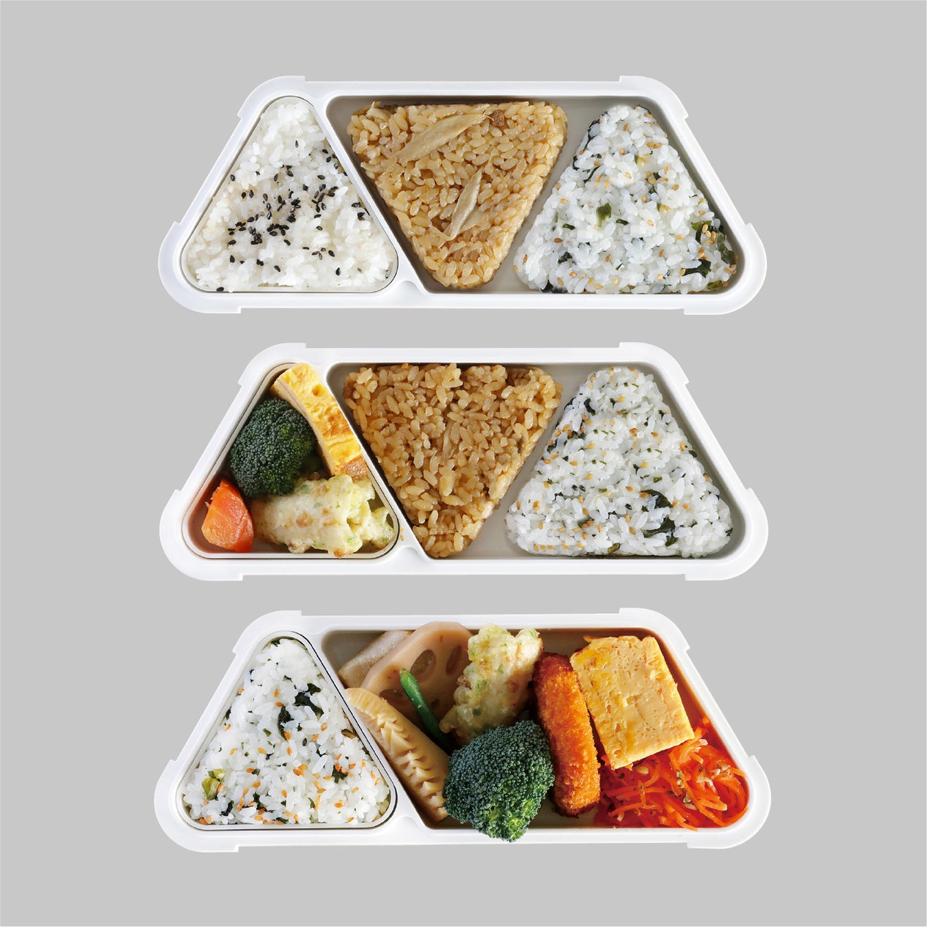 特徴的な台形型はおにぎりが3つ気持ちよく収まる仕様の「薄型弁当箱 抗菌フードマン おにぎり」。