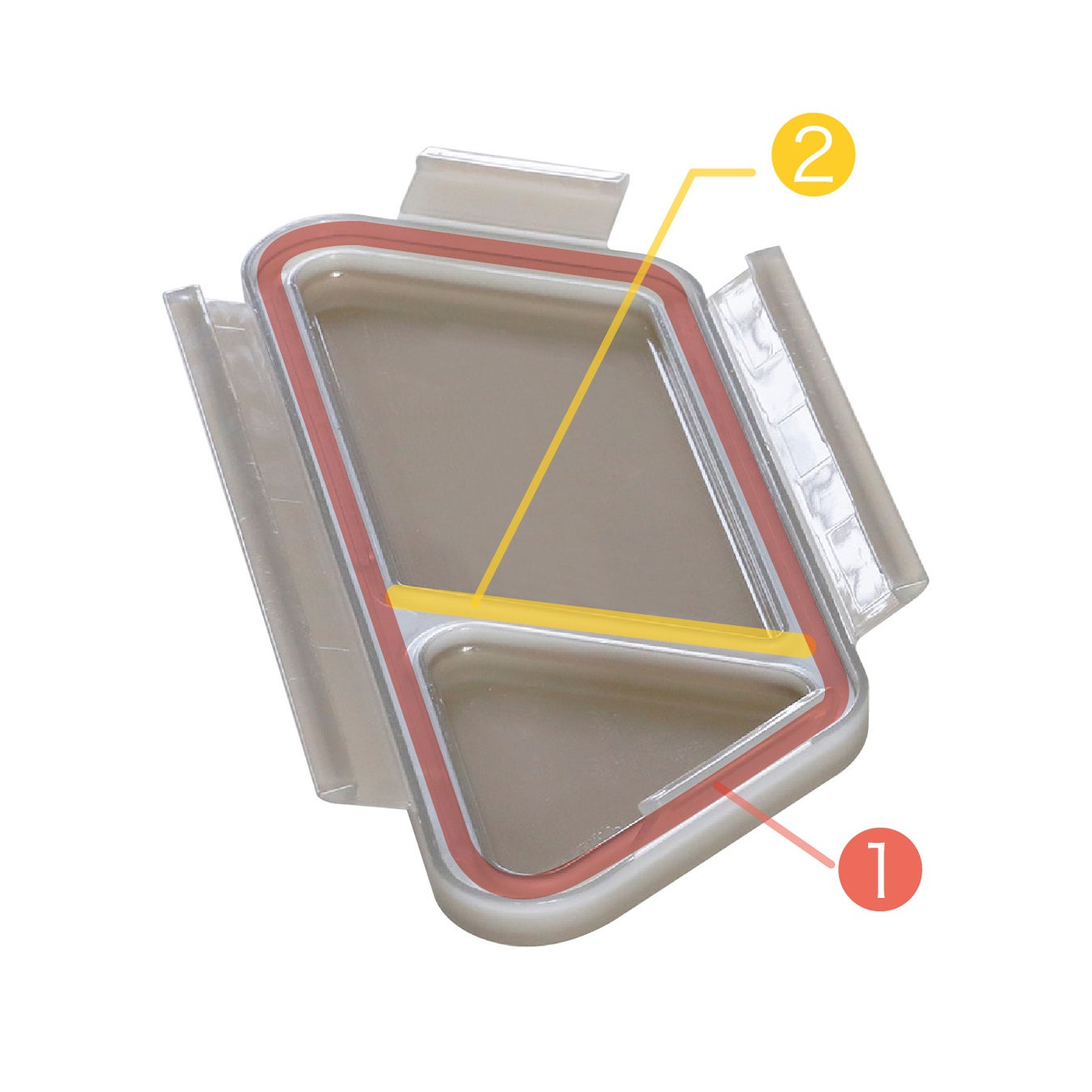 ❶が本体の周囲をシーリングし、❷が中仕切りをシーリングするWシーリング構造で、汁漏れを防止。