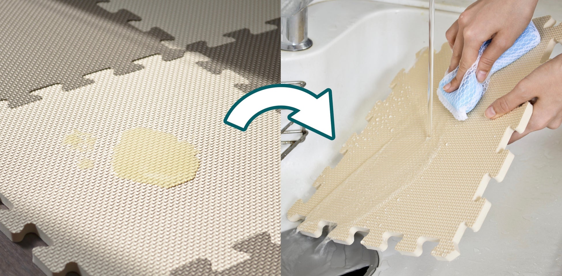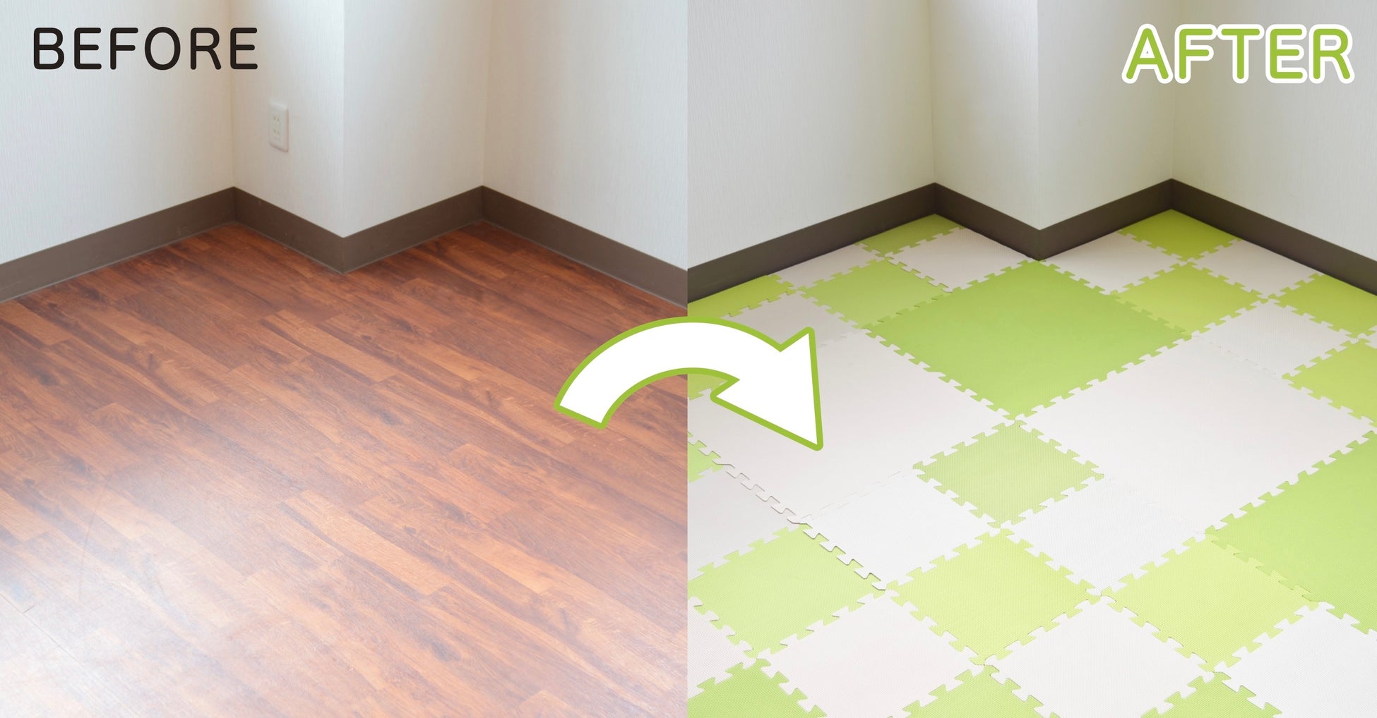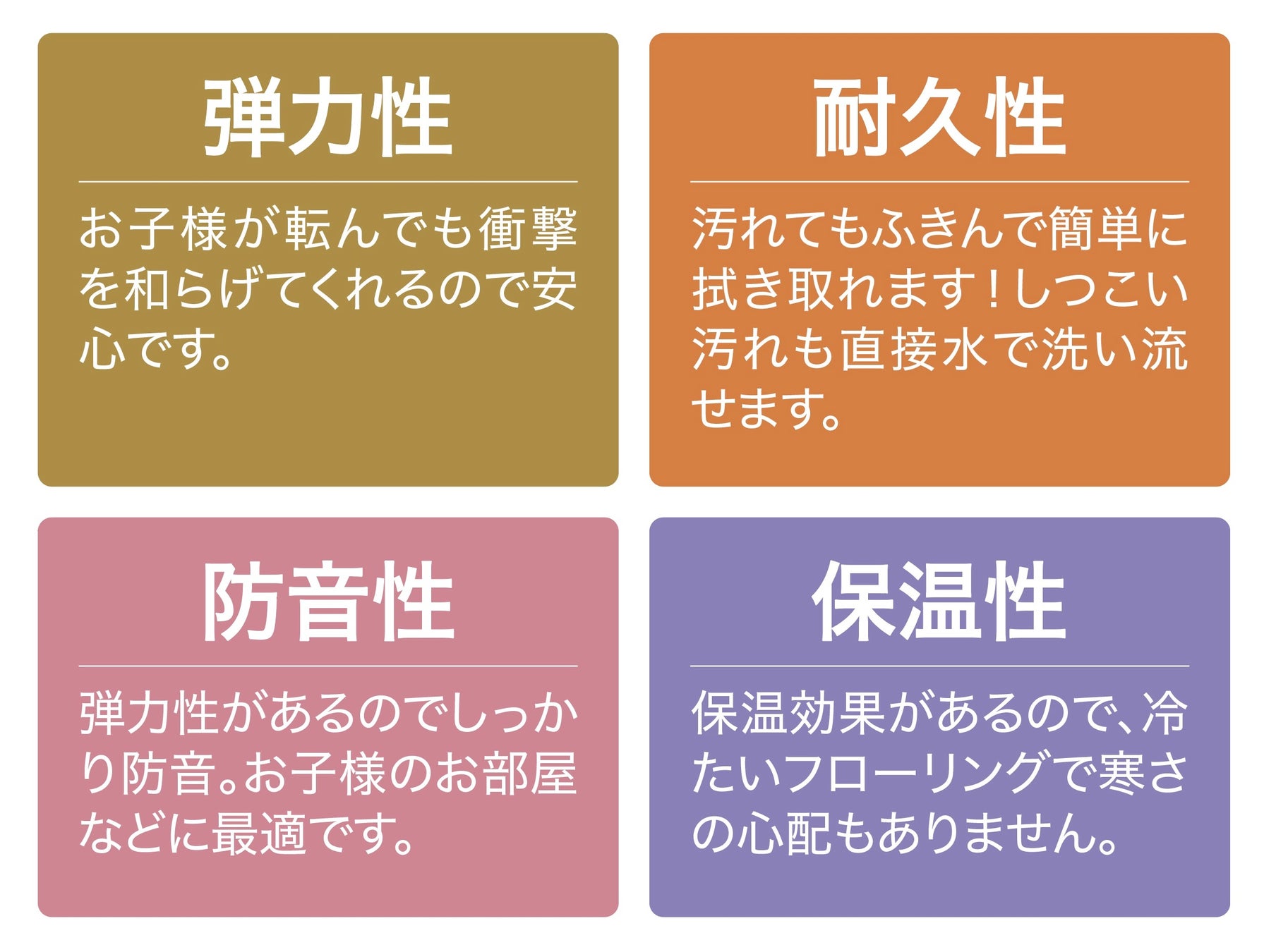 お子様が転んだときや家具の脚などから床を守る“弾力性”、例え汚れても簡単に拭き取れる“耐久性”、マンションなどで心配な足音を軽減してくれる“防音性”、冷たいフローリングを踏んだときに感じる「ヒヤッと感」を和らげてくれる“保温性”を兼ね備えています。