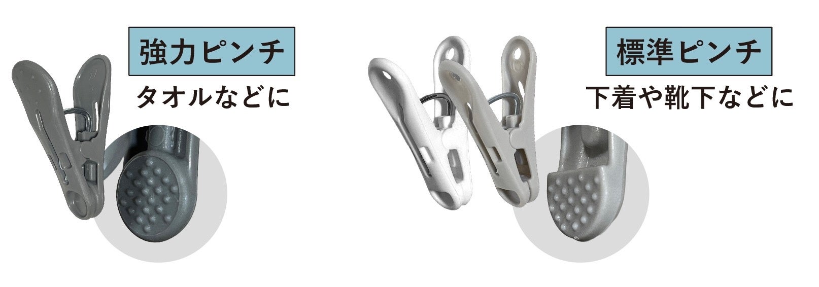 角ハンガーには、ホワイト、ライトグレーの標準ピンチ、ダークグレーの強力ピンチの2種類のピンチがついています。