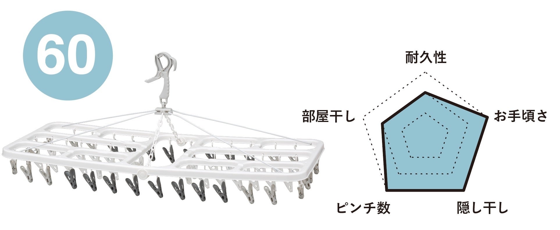 ボトムスから靴下などの小物まで、1つでまとめて干すのに便利な60P。
