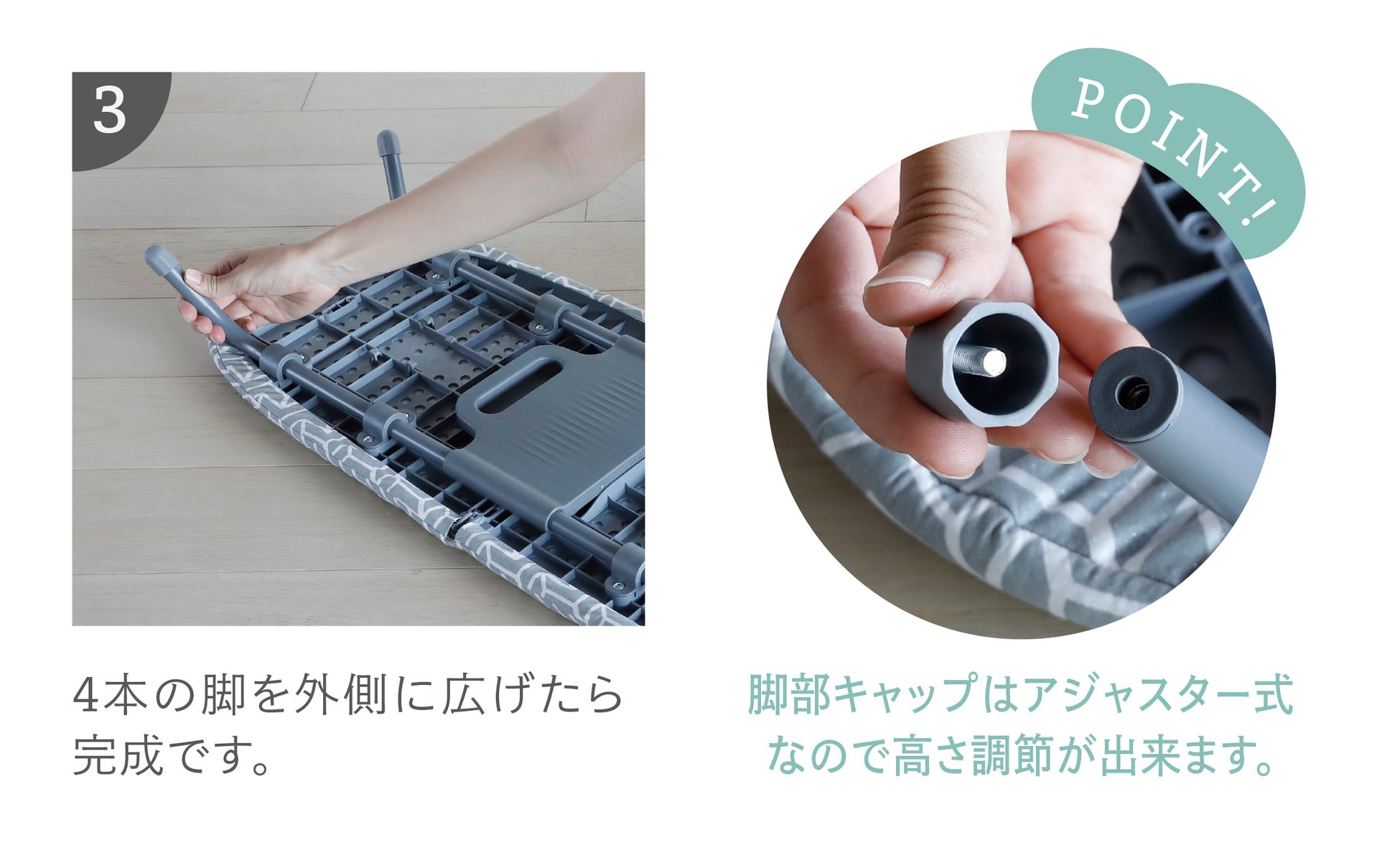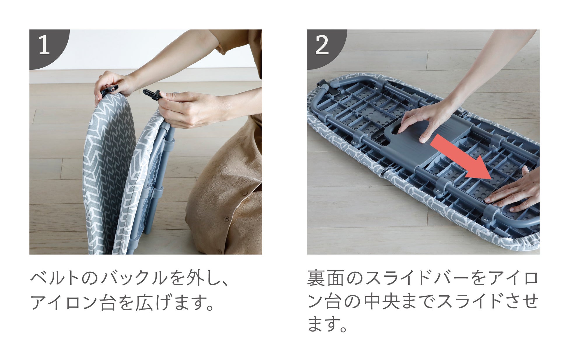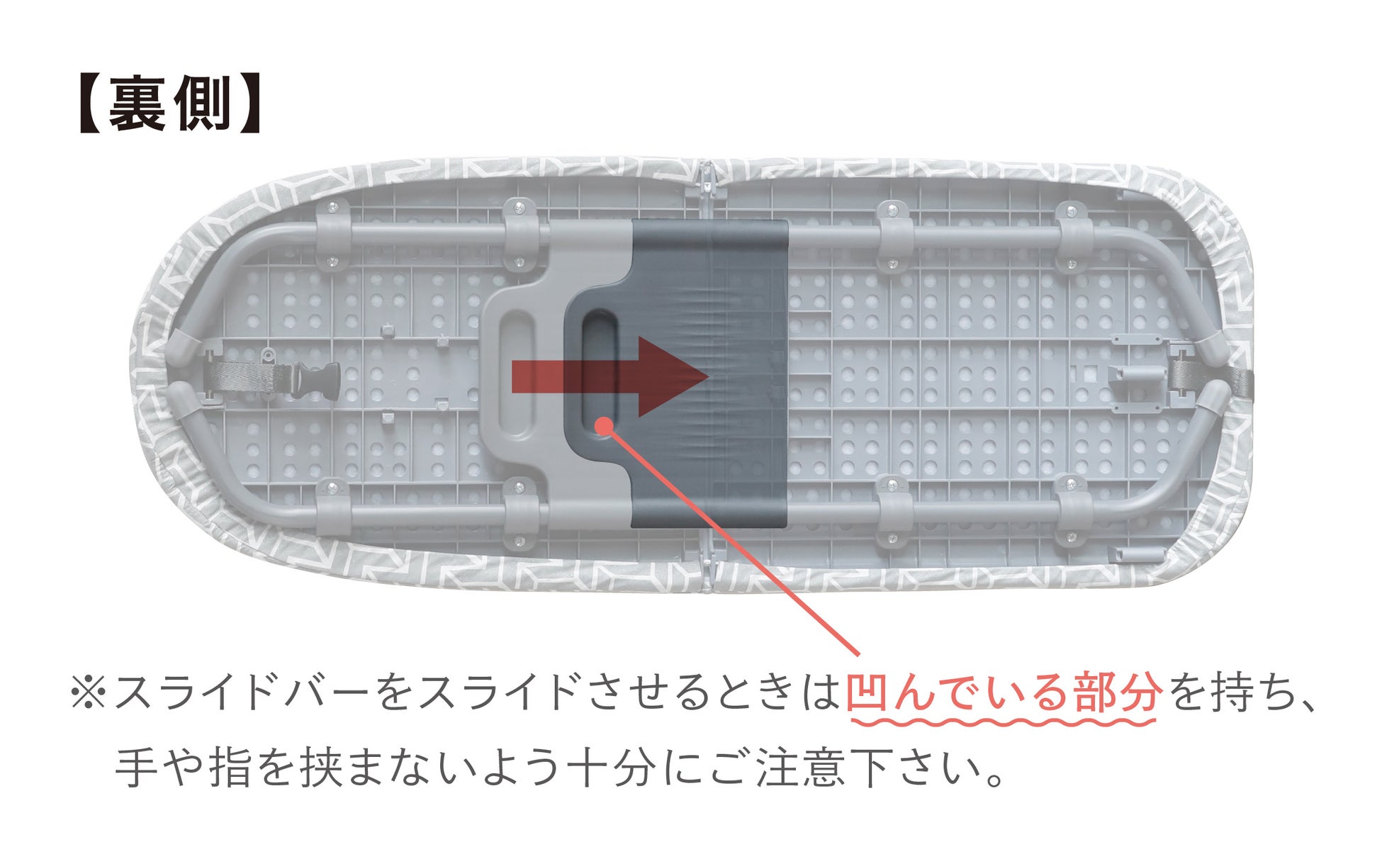 裏側のスライドバーで固定することにより、折り畳み型なのに“アイロンかけ面がフラット”&“抜群の安定感”を実現しました。