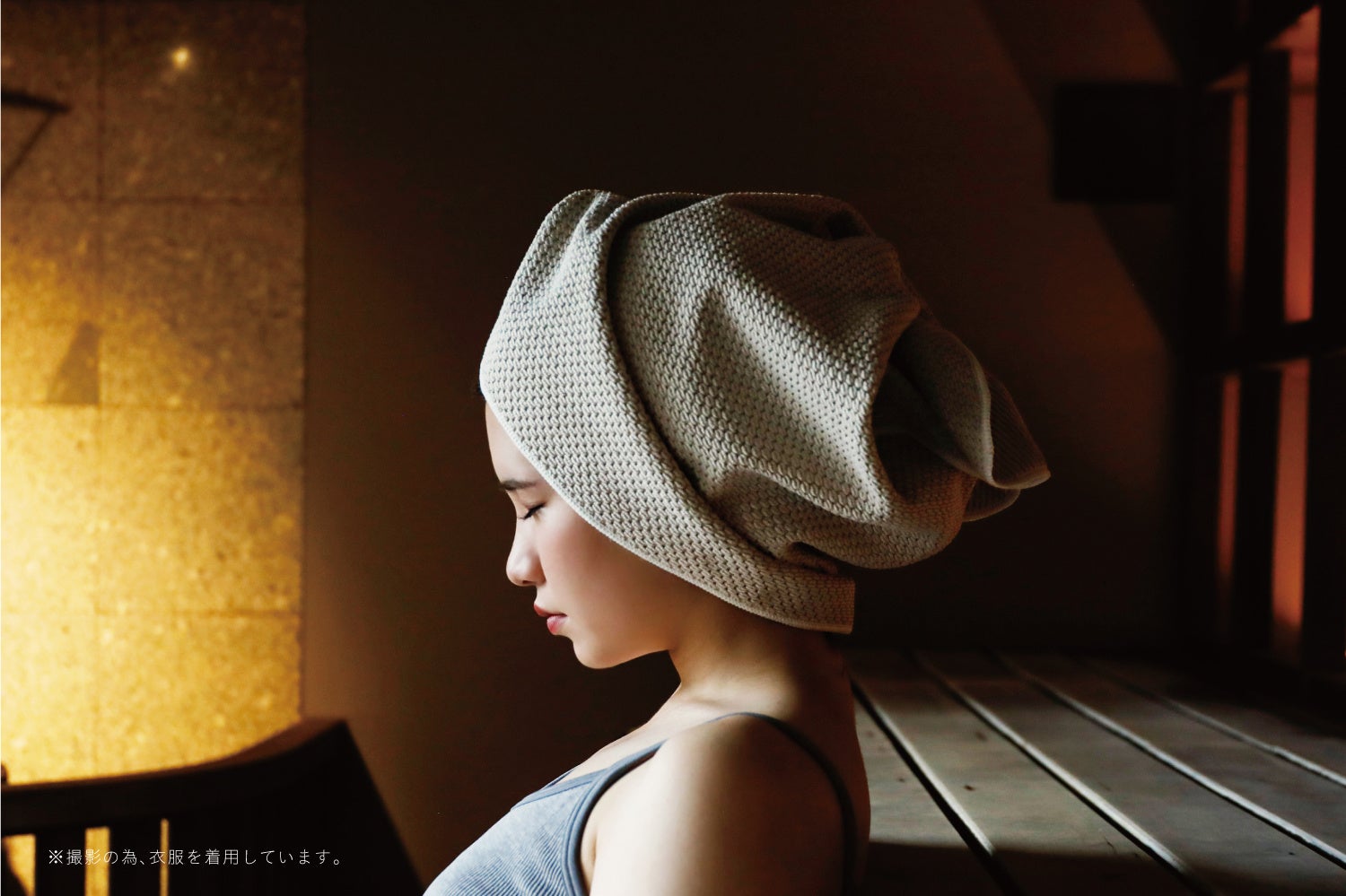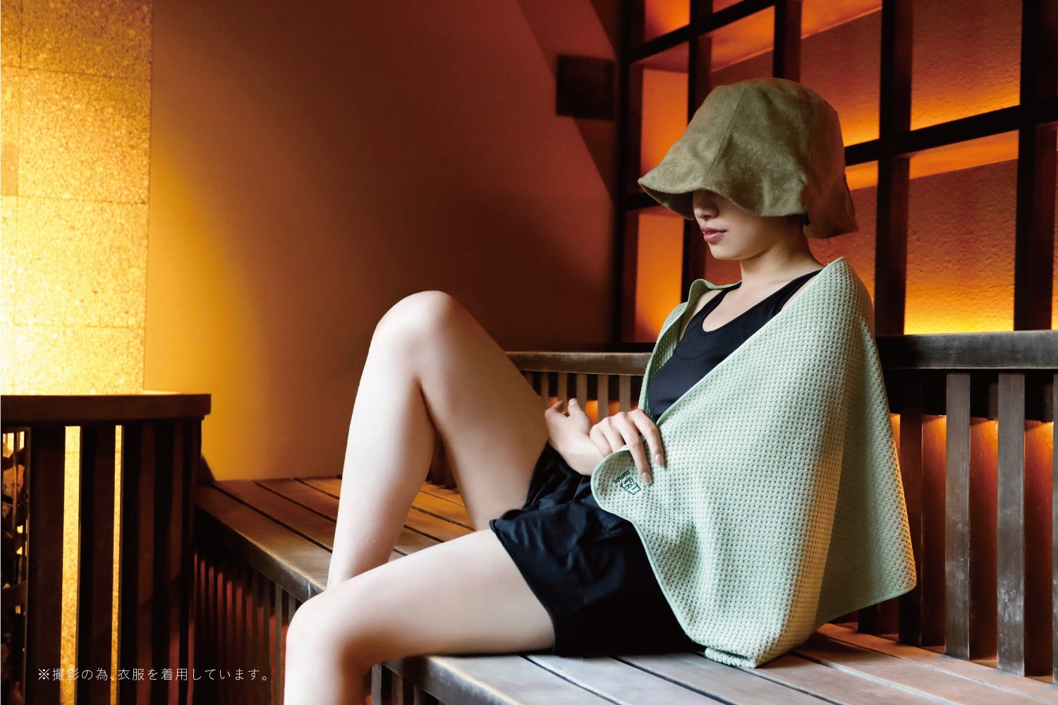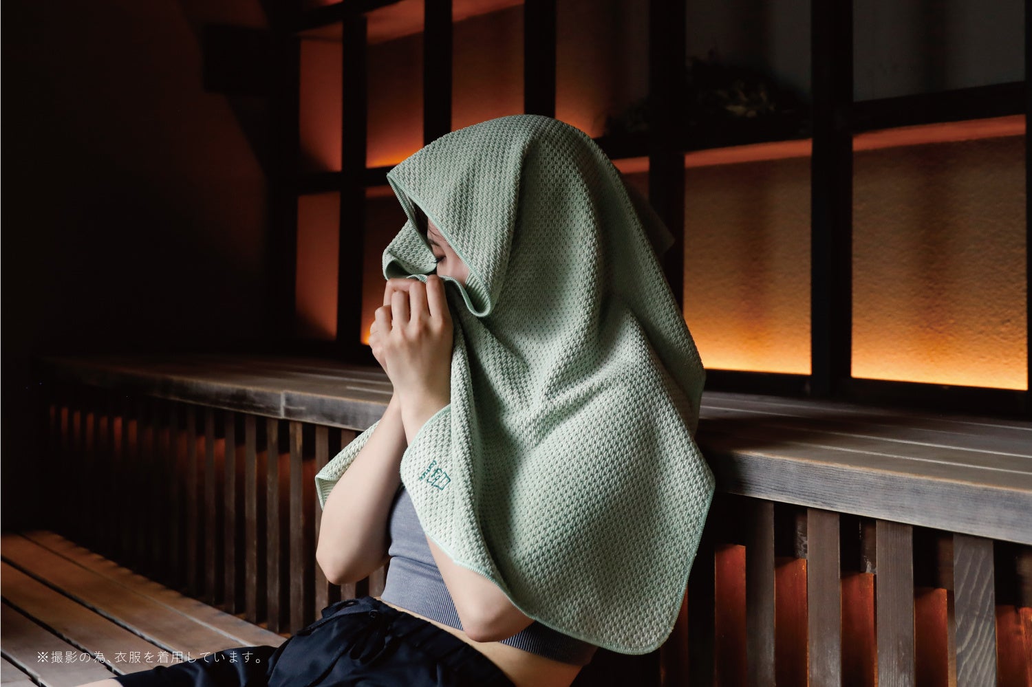 フードのように被って、熱波から顔・頭皮を守ることが出来ます。また、周りの環境音や照明の光などを遮ることが出来るので、『よりサウナに没入』することが出来ます。サウナハットを被るのにまだ抵抗があるという方でも、このタオル一枚さえあれば、サ活をよりお楽しみ頂けます。